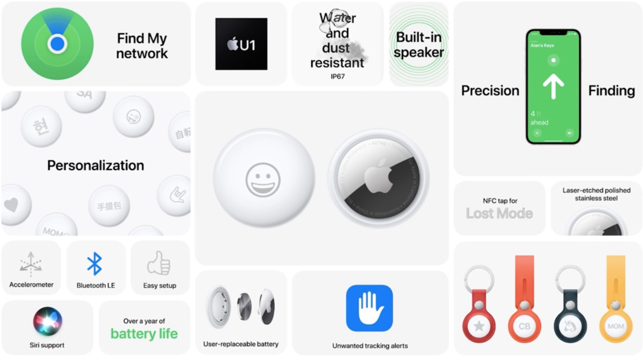 Каждый AirTag включает в себя чип U1, который, по словам Apple, обеспечивает уникальные функции точного отслеживания для пользователей iPhone 11 и iPhone 12. Чип U1 можно использовать для более точного определения расстояния и направления до потерянного AirTag, когда он находится в пределах досягаемости. По мере движения пользователя Precision Finding объединяет входные данные с камеры, ARKit, акселерометра и гироскопа, а затем направляет его в AirTag, используя комбинацию звука, тактильных ощущений и визуальной обратной связи.