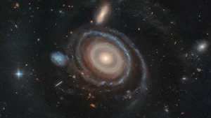 Телескоп Hubble зафиксировал редкое космическое зрелище — гигантскую галактику LEDA 1313424 с девятью кольцами, образованными после столкновения с голубой карликовой галактикой. Ученые считают это счастливым открытием, подтверждающим давние теории о природе галактических столкновений.