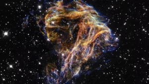 На этом изображении, напоминающем искры фейерверка, на этом изображении, сделанном камерой Лаборатории реактивного движения на борту космического телескопа Hubble, видны тонкие нити, представляющие собой листы обломков от звездного взрыва в соседней галактике Большого Магелланова Облака.