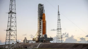 Ракета Artemis I Mega Moon находится на стартовой площадке Космического центра Кеннеди NASA во Флориде. Эта мощная ракета системы космического запуска (SLS) готовится к запуску космического аппарата Orion и его служебного модуля.