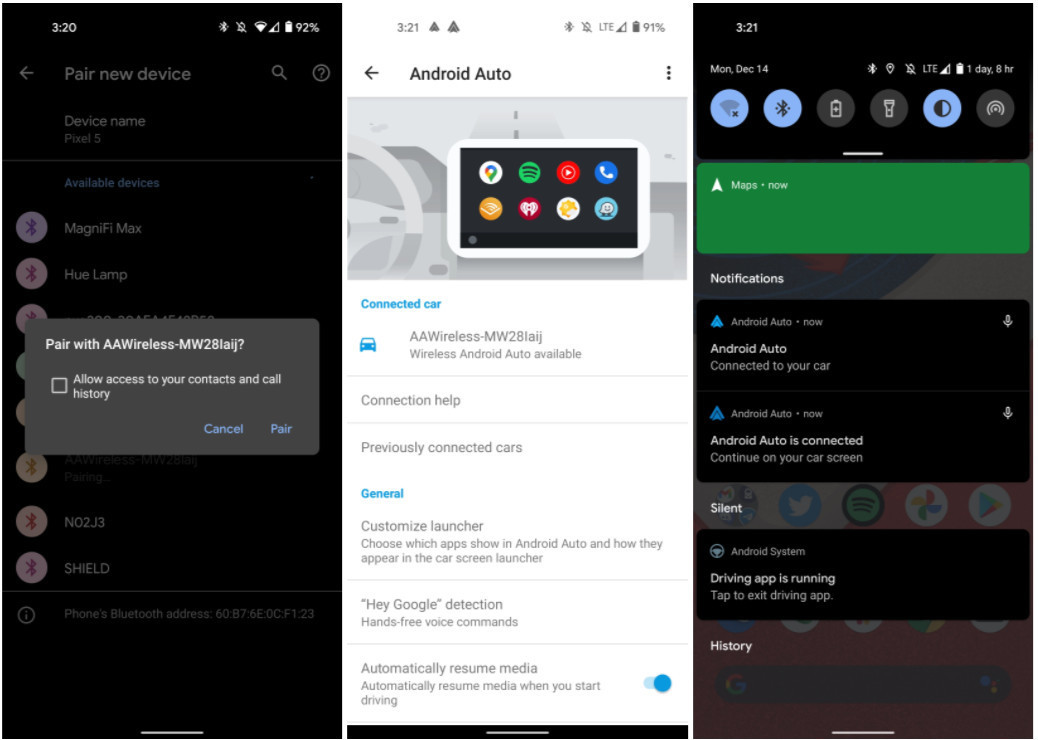 AAWireless подключается к USB-порту вашего автомобиля, как и обычный телефон. Во время первой настройки устройству требуется несколько секунд, чтобы включиться, а затем вы подключаетесь к нему через Bluetooth, как с парой беспроводных наушников. Оттуда настройка будет такой же, как и в обычном Android Auto.