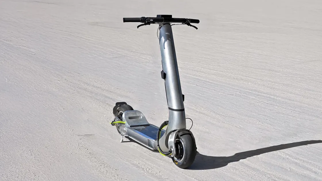 Бонневиль — место, где в 1935 году впервые преодолели рубеж 300 миль в час (483 км/ч). Сейчас там соревнуются самые безумные машины: от газонокосилок до мотоциклов с двигателями Ducati. Но электрический самокат за 30 000 $ — это новый уровень.