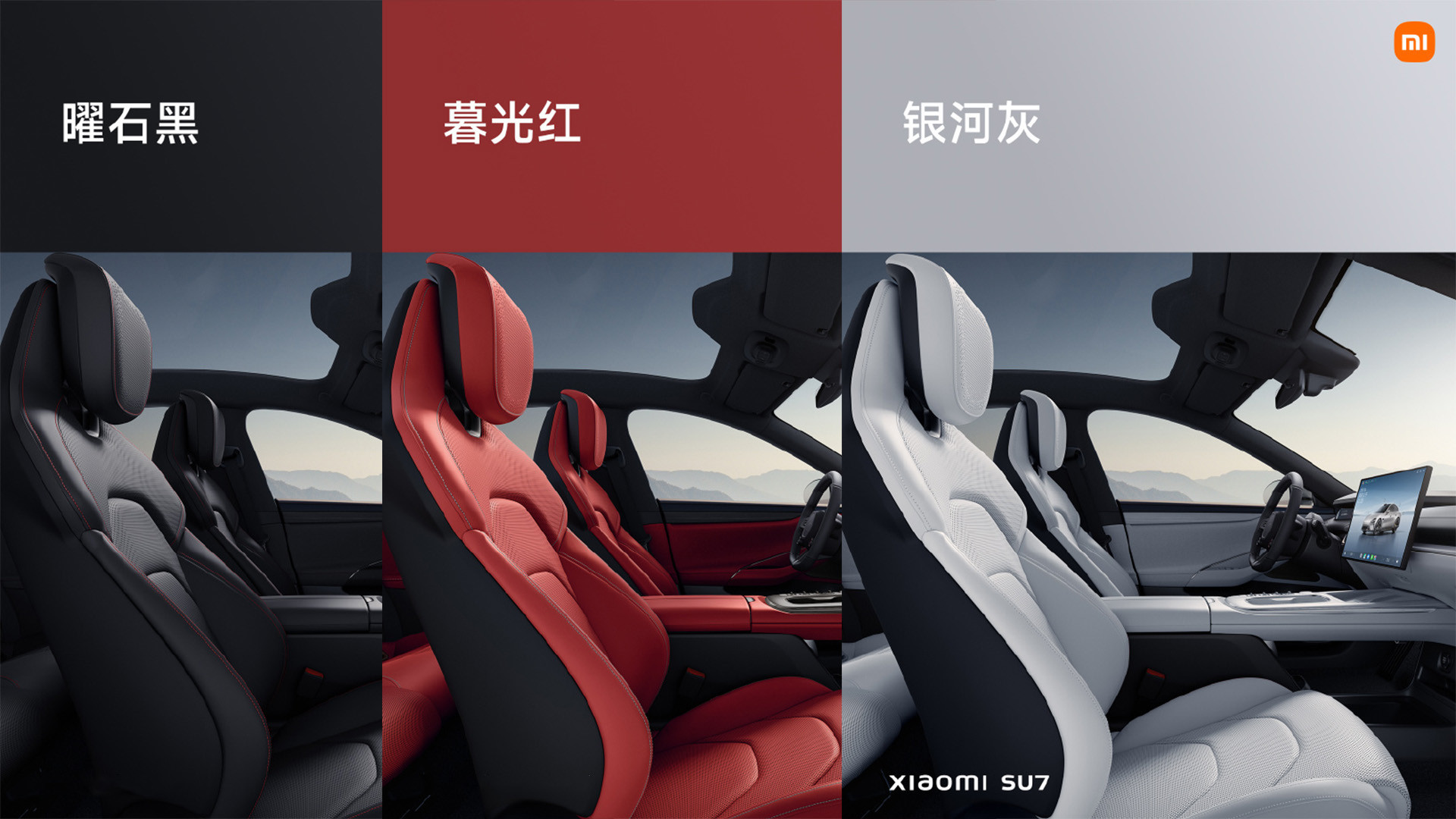 Внутренний интерьер Xiaomi SU7 предлагает три цветовых варианта салона: Galaxy Grey, Twilight Red и Obsidian Black. Он также оборудован автомобильным остеклением площадью 5,35 кв.м, рулевым козырьком и солнцезащитным защитным слоем.