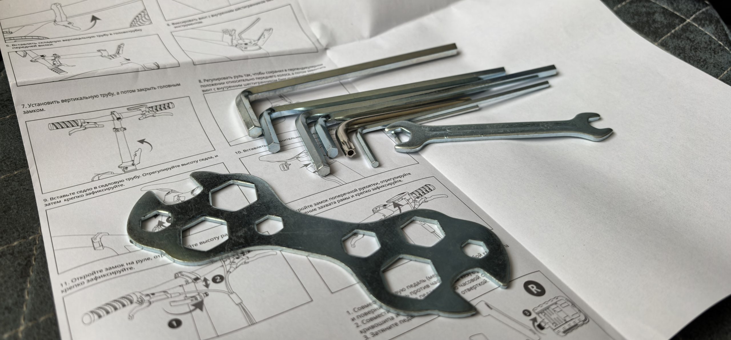 На этом этапе хочется отметить два приятных момента, связанных с комплектом ADO A20S Air. Помимо блока зарядки, у вас на руках оказывается полный комплект всех необходимых шестигранных ключей, небольшой гаечный ключ и еще один велосипедный “мультитул”. Этого набора достаточно для того, чтобы открутить или закрутить что угодно на велосипеде, а также установить навесное оборудование на ваш выбор.