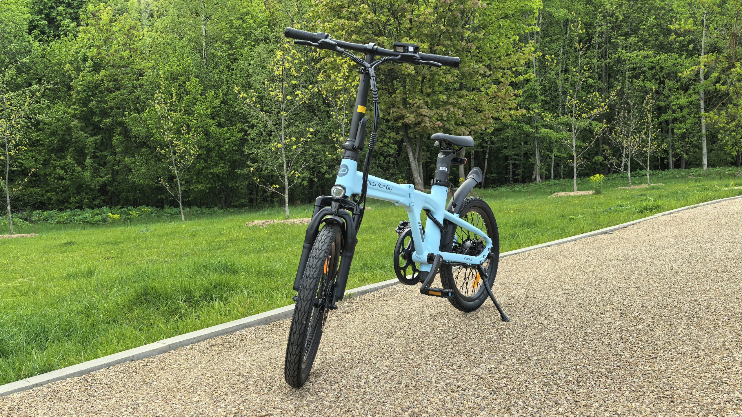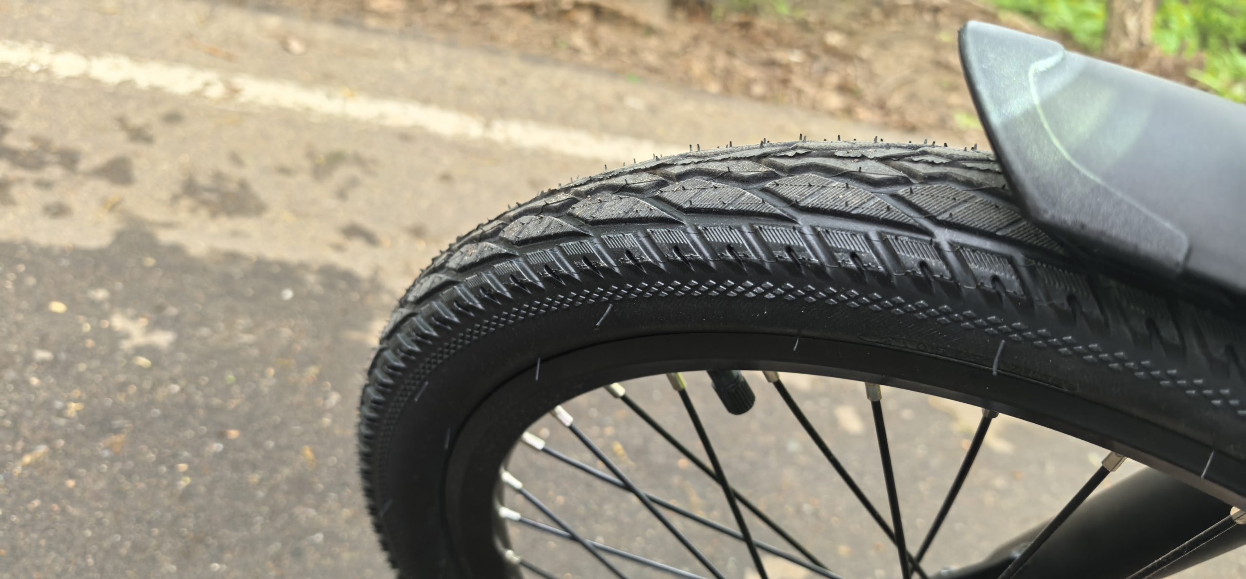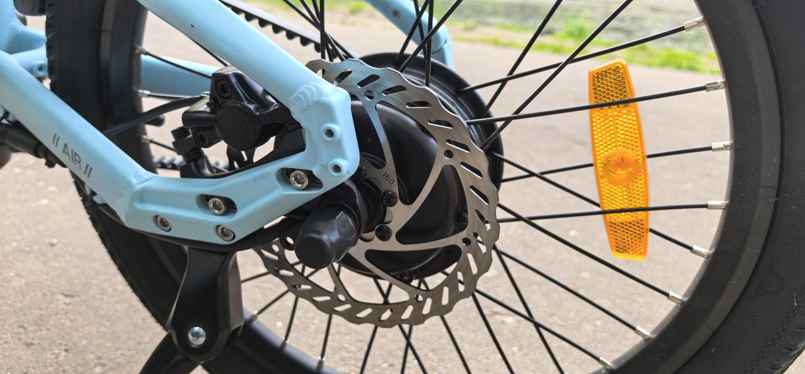 Несмотря на то что ADO A20S Air относится к компактным складным городским электровелосипедам, его колеса достаточно внушительные: диаметр 20 дюймов, ширина шин почти 5 см. Они играют не последнюю роль в комфорте при езде по неровным поверхностям вроде брусчатки и в паре с амортизирующей вилкой позволяют реже обращать внимание на огрехи в дорожном покрытии.
