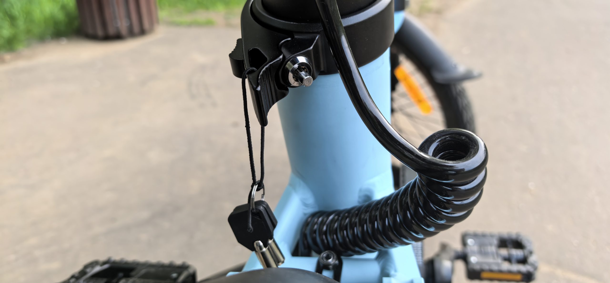 Ну и последнее, но не по значению — замок на батарее. Дело в том, что не только прогресс не стоит на месте, но и уличные воришки. Угнать целый велосипед куда труднее, чем вытащить не менее ценную батарею, которую и продать легче. Собственно, это небольшой замок сделает для сохранности ADO A20S Air очень многое. Просто закрываете замок нажатием на металлический штырек — и всё. Теперь достать батарею можно будет только после поворота комплектного ключа.