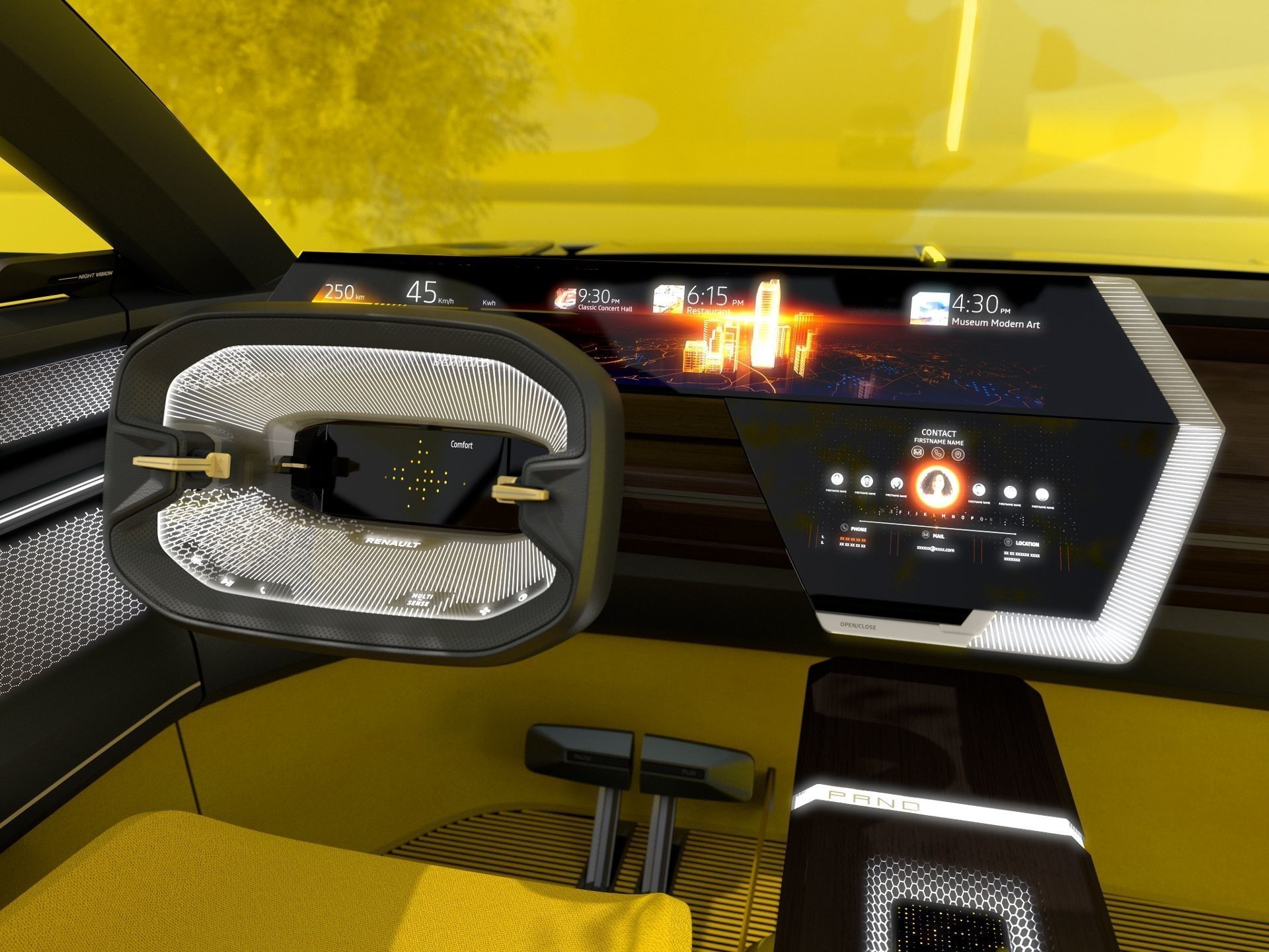 Салон шоу-кара выглядит очень фаталистично. Во многом это заслуга приборной панели — необычной формы руль, в центре которого расположен экран диагональю 10,2″, на котором должны отображаться основные данные для водителя. Передняя панель представляет собой систему LivingScreen с двумя экранами. На месте центрального тоннеля располагается крайне массивная консоль. К слову, материалы для отделки созданы из переработанных дерева, пластика и ткани, для минимизации вреда, наносимого окружающей среде.