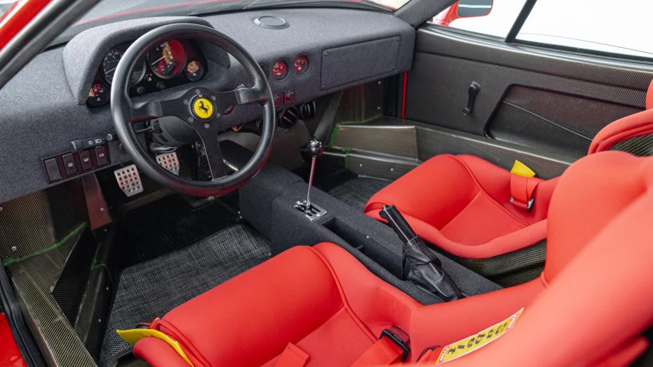 Интерьер Ferrari F40 подчеркивает фокус на производительности, предоставляя минималистичный и функциональный кокпит для настоящего водительского опыта. В салоне нет роскоши, здесь сосредоточены на ключевых элементах. Ковшеобразные гоночные сиденья с красной тканевой обивкой, трехспицевый руль, базовые приборы и легкие дверные панели создают атмосферу увлекательного вождения.