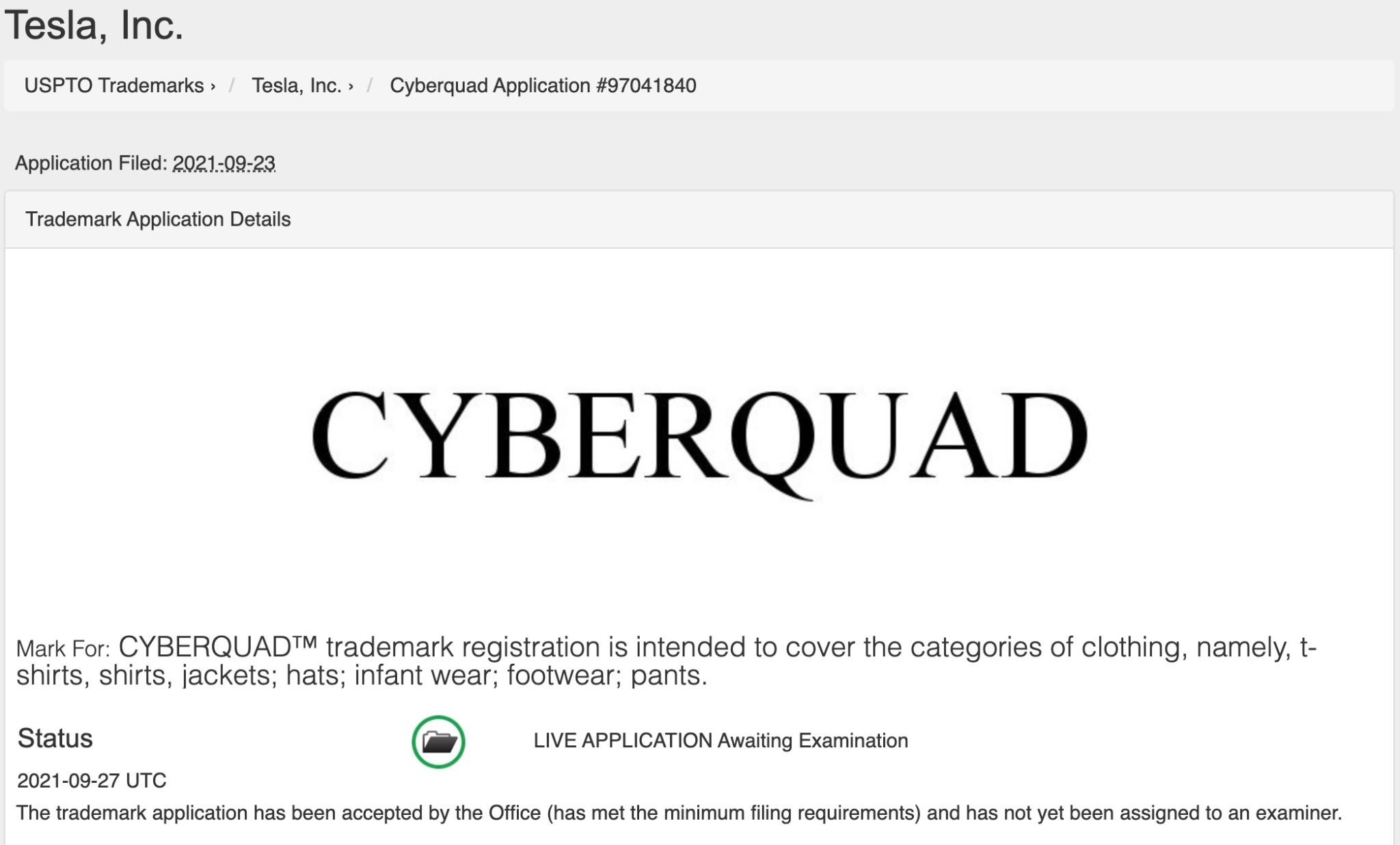 Исходя из текста заявки, брендинг Cyberquad должен использовать для размещения на одежде, поскольку Tesla уже подавала заявку на регистрацию торговой марки квадроцикла еще в 2019 году.
