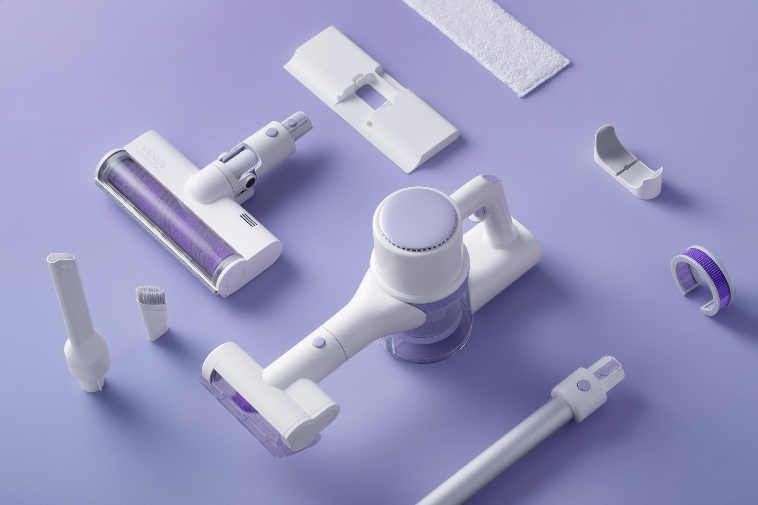 В комплектацию устройства входит 4 щетки для уборки пола и мебели в труднодоступных местах: электрощетка для пола, 2-в-1 щелевая насадка, щетка для очистки пылесоса, электрощетка для мягкой мебели, а также комплект для влажной уборки и магнитное крепление для стены.