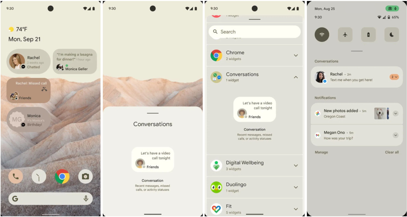 Мы видим, что песочный акцент используется для раскрашивания всего, от строки поиска до виджетов. Кстати, первый макет ниже показывает несколько виджетов «Беседа» для «Последние сообщения, пропущенные звонки или статусы активности». Имея размер 2×1, они имеют изображение профиля отправителя и предварительный просмотр сообщения. Приведенные ниже примеры юмористически оформлены персонажами из друзей и заполнены из Facebook Messenger. Предположительно, разработчикам придется поддерживать изменения на системном уровне. В целом, эти виджеты показывают, как Google планирует в этом году продвинуть Android 11 и сделать операционную систему, ориентированную на людей, еще дальше.