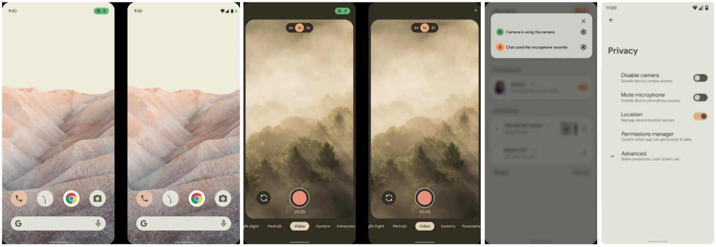 Что касается конфиденциальности, Google будет предупреждать пользователей, когда микрофон или камера активны. В правом верхнем углу статуса появится зеленая таблетка, которая превращается в точку. При нажатии на листе уведомлений появляется дополнительная информация со ссылками на настройки. Новая унифицированная страница настроек конфиденциальности позволит пользователям «Отключить камеру», «Отключить микрофон» и включить/выключить определение местоположения на высоком уровне. Последний элемент управления в настоящее время является отдельной страницей предпочтений.