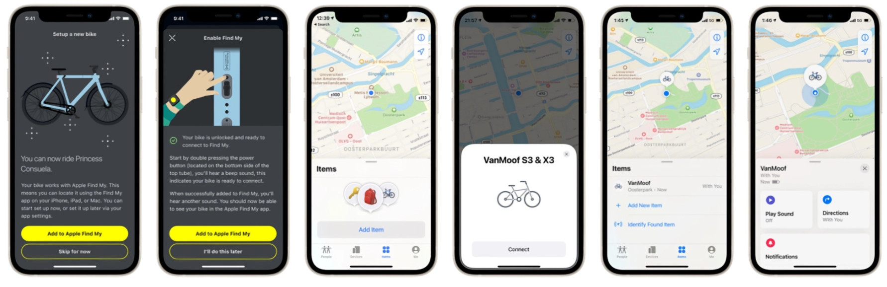 Вы можете подключить VanMoof S3 или X3 к приложению Find My на своих устройствах Apple, выполнив несколько простых шагов. После настройки вы можете просмотреть и найти свои VanMoof S3 и X3 вместе с другими поддерживаемыми устройствами на новой вкладке «Элементы». В дополнение к ведущим в отрасли мерам безопасности VanMoof, если ваш велосипед VanMoof когда-либо пропадет, у вас теперь есть возможность использовать приложение Find My, чтобы принять меры по его восстановлению. Если он рядом, вы можете воспроизвести звук, чтобы его легко найти, а если он находится дальше, просто переведите велосипед в режим пропажи и позвольте сети Find My найти его.