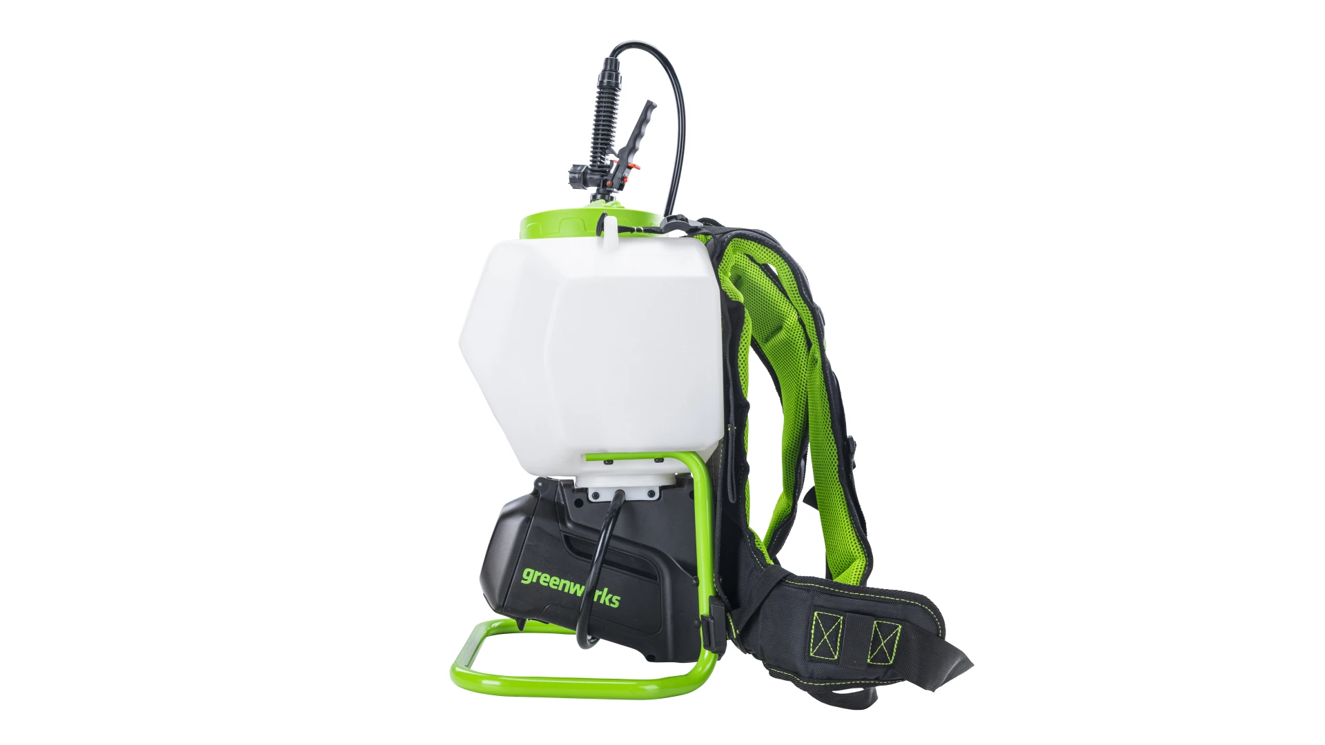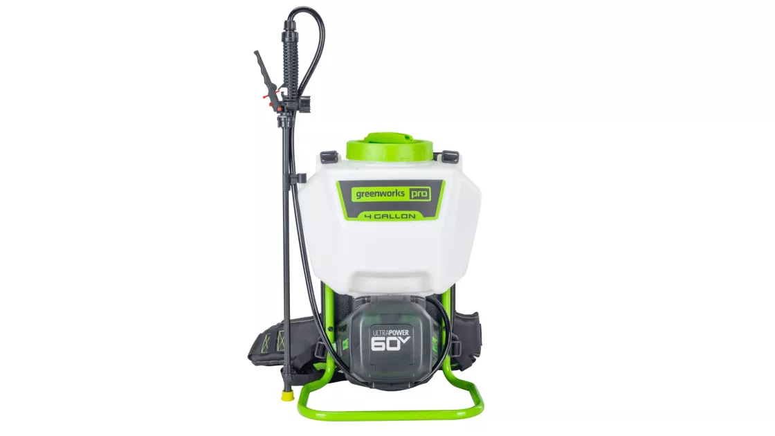 Опрыскиватель работает от аккумулятора Greenworks на 60 В — это часть общей экосистемы, куда входят газонокосилки, кусторезы, воздуходувки и прочая техника. Один аккумулятор — много инструментов.