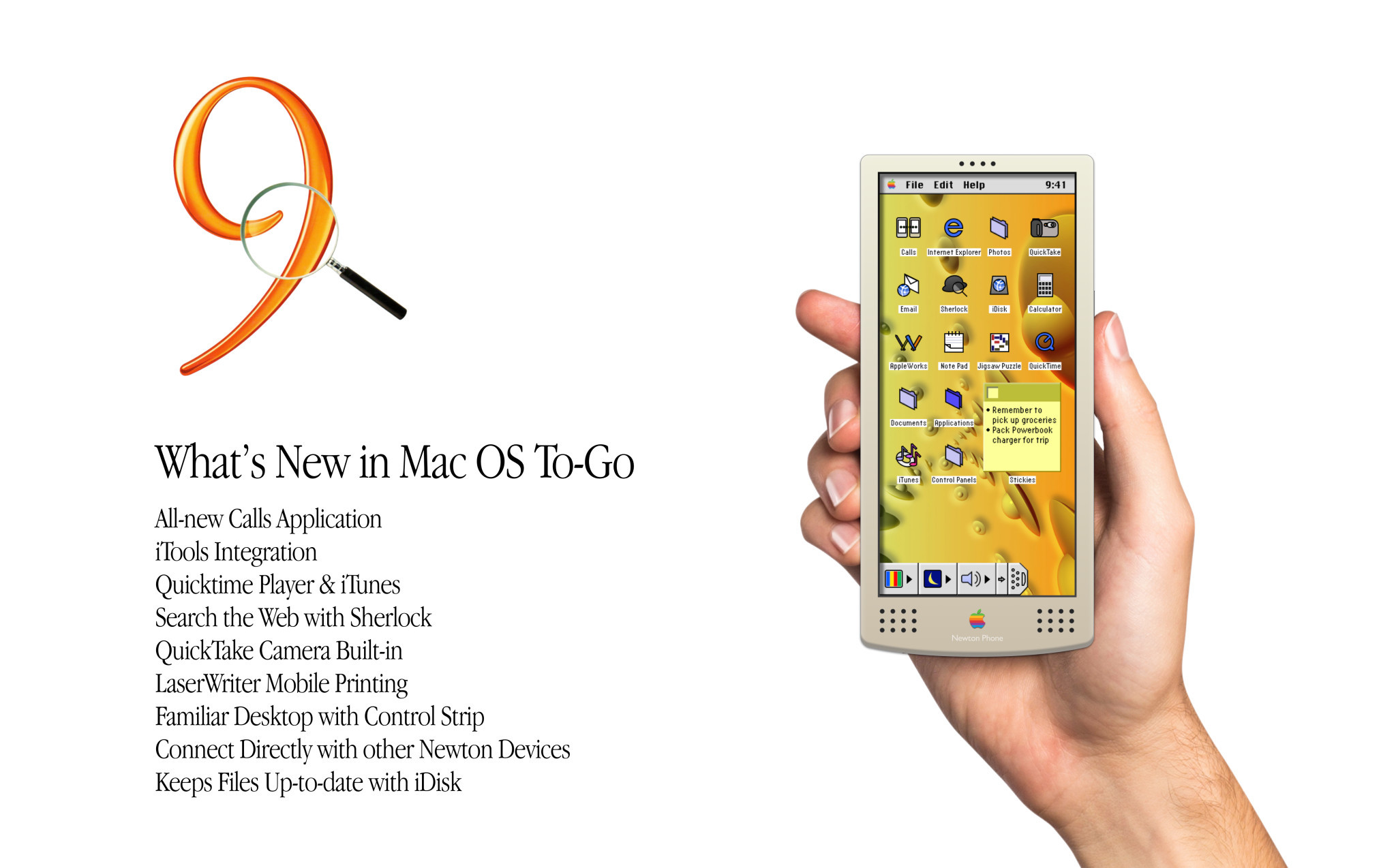 Согласно концепции Mac OS 9 To-Go интегрирован с iTools, Sherlock, iDisk и другими веб-протоколами. Он может печатать прямо на принтерах Apple LaserWriter и имеет встроенную систему камер QuickTake. Но, достаточно слов. Переходим к продуктам!