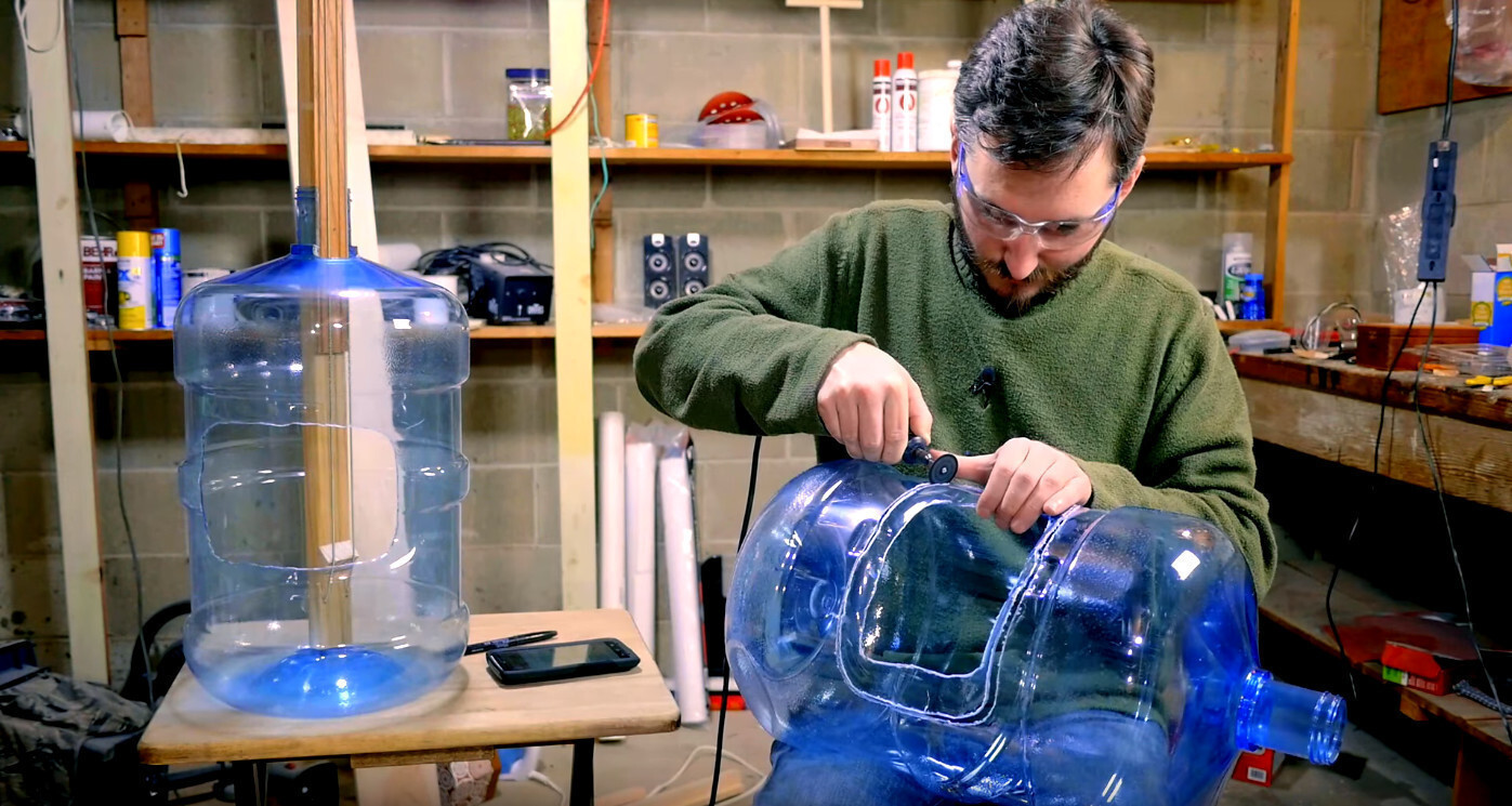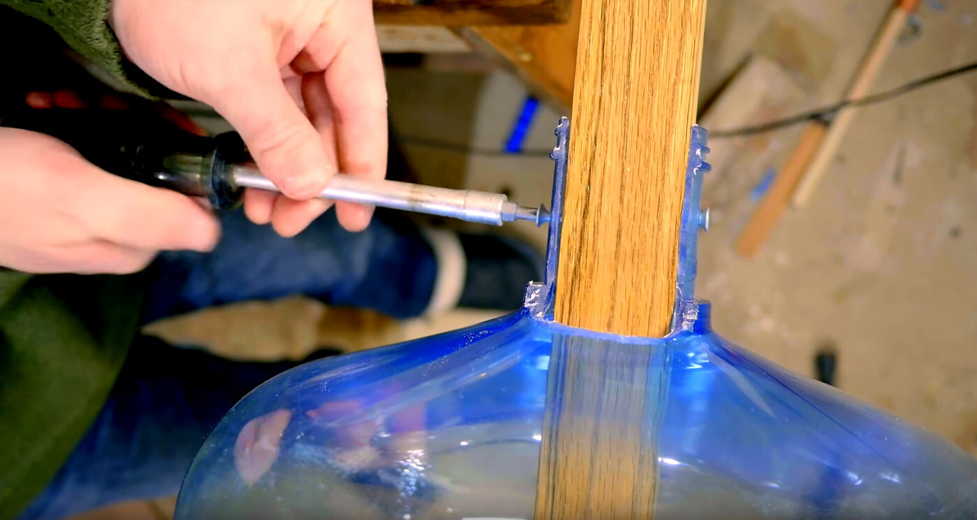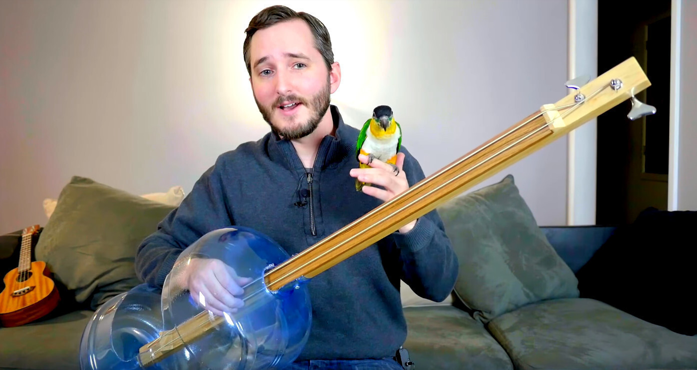 В своей инструкции Бен пошагово объясняет, как изготовить гитару самостоятельно. В качестве корпуса, придающего акустическому басу неожиданно богатый звук, выступает стандартная бутылка для кулера, в которой вырезается отверстие для руки.