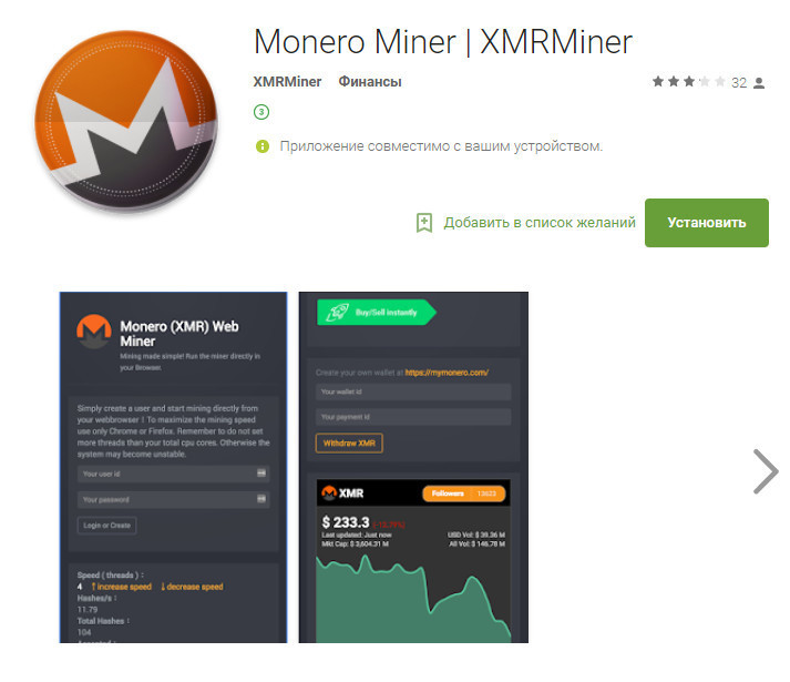 В сентябре 2017 года в Google Play появилось приложение Monero Miner (XMR) разработчика My Portable Software. Согласно описанию, программа добывает криптовалюту Monero в мобильном браузере. Сумма намайненных XMR отображается в специальном окне.