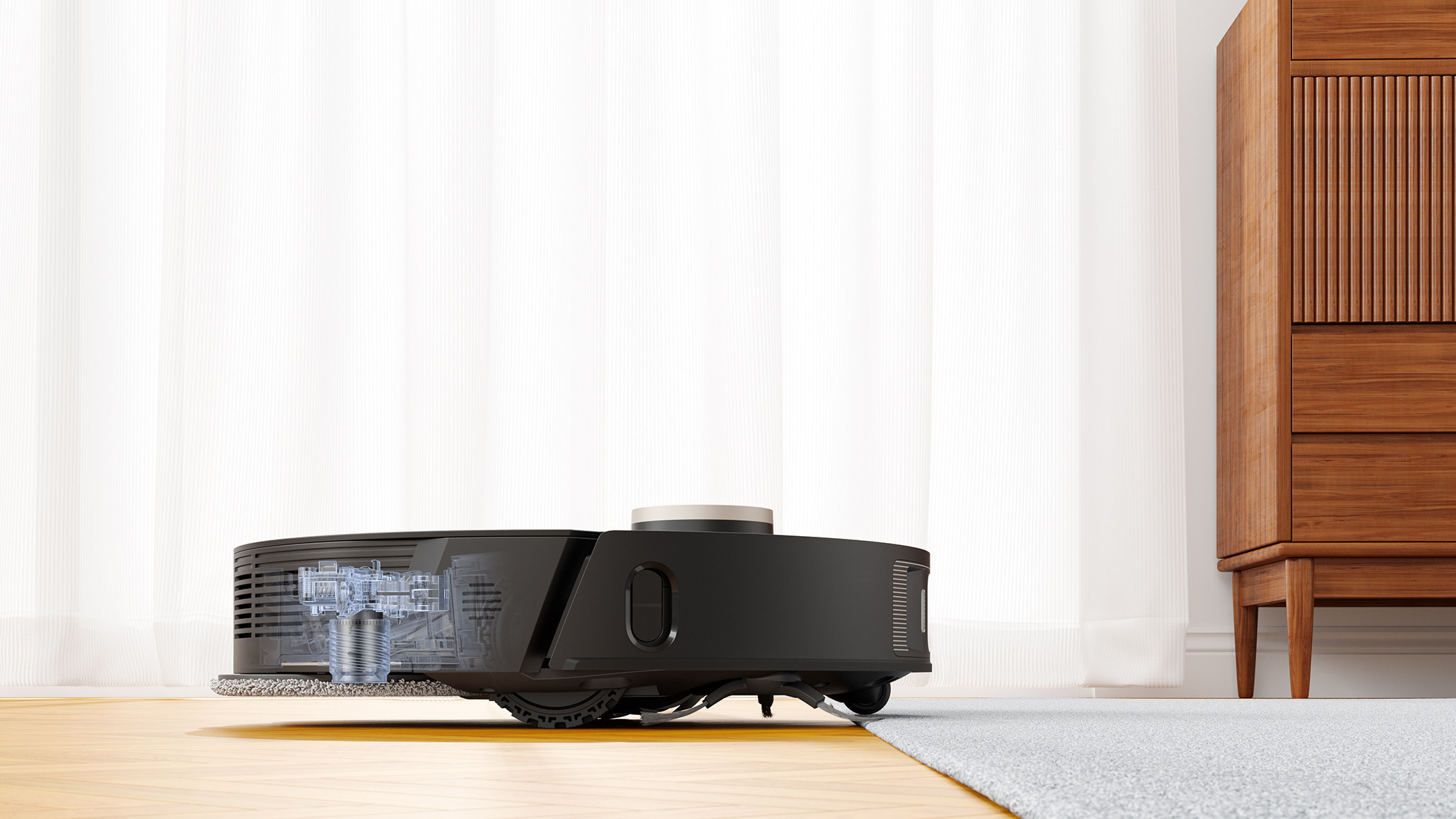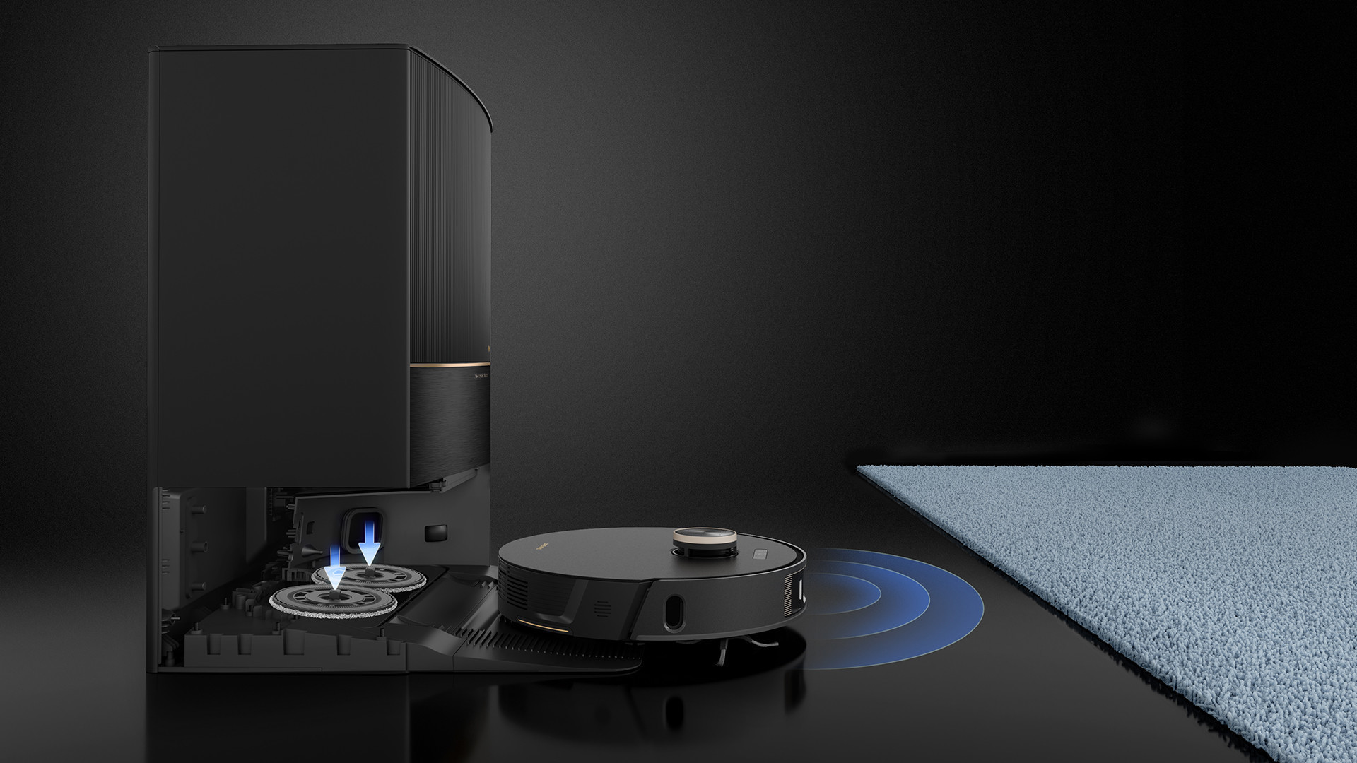 Перевернув Dreame L 30 Ultra, можно увидеть целый ряд интересных решений. Первое что бросится в глаза, — это весьма высоки колеса. Прямой порог высотой 2-2,5 см не станет для робота проблемой. Для влажной уборки используется две вращающихся щетки, и вы можете подумать, что они не самым лучшим образом скажутся на “проходимости” пылесоса. Не в этом случае: в неактивном положении щетки подняты и опускаются только в зонах влажной уборки.