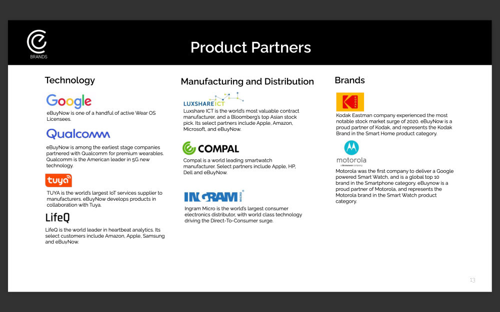 В другом месте на слайде «Партнеры по продукту» говорится, что «eBuyNow — один из немногих действующих лицензиатов Wear OS», а компания — «одна из первых компаний, заключивших партнерские отношения с Qualcomm для создания носимых устройств премиум-класса».
