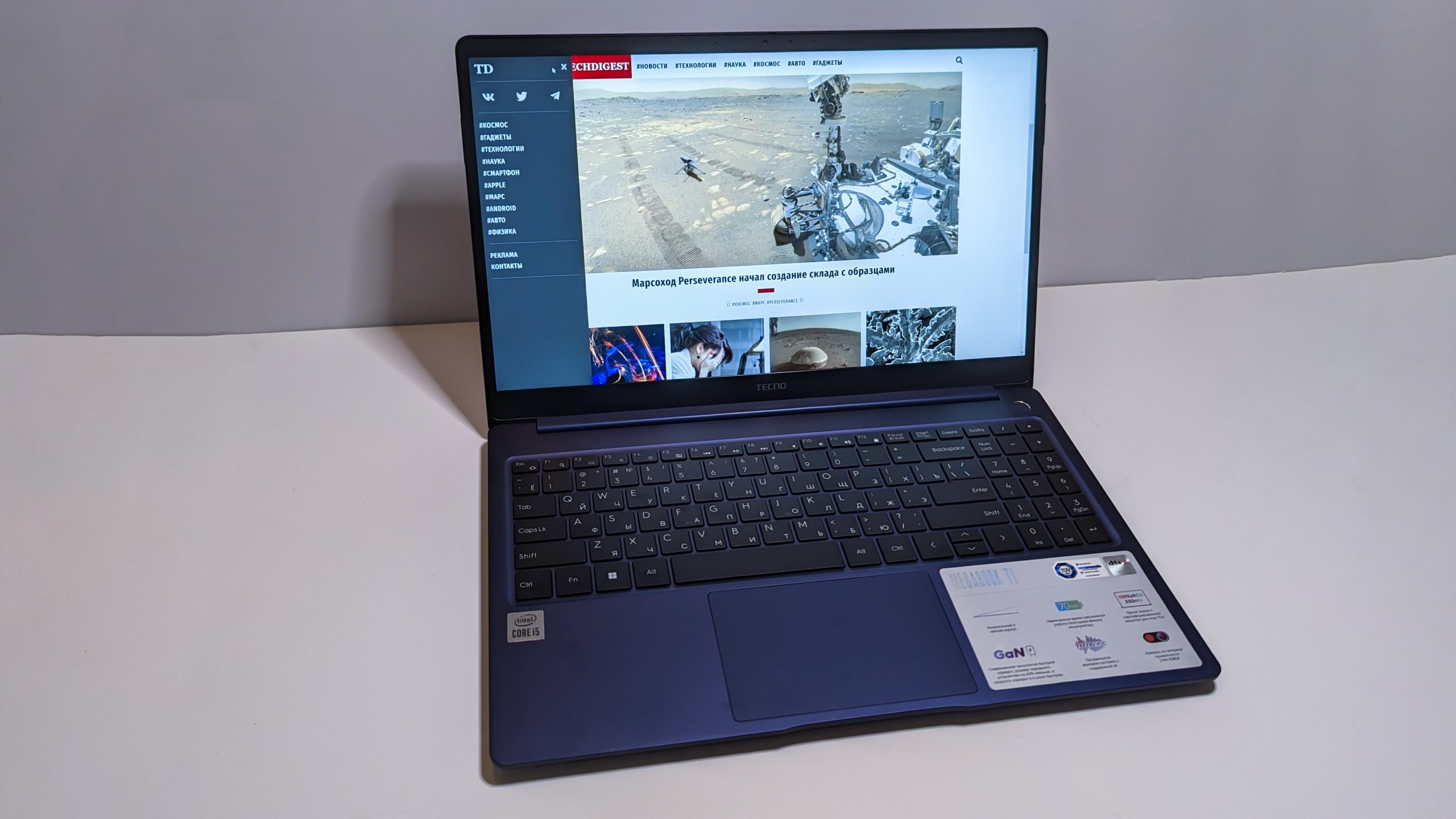 Размеры TECNO Megabook T1 35,8×23,7×2,1 (в самом толстом месте), что весьма компактно для ноутбука с экраном 15,6 дюйма. Вес ноутбука чуть больше 1,5 килограммов, и хотелось бы написать “без учета зарядного устройства”, но оно тут чуть больше, чем у среднестатистического смартфона. При этом ноутбук обладает великолепной автономностью.