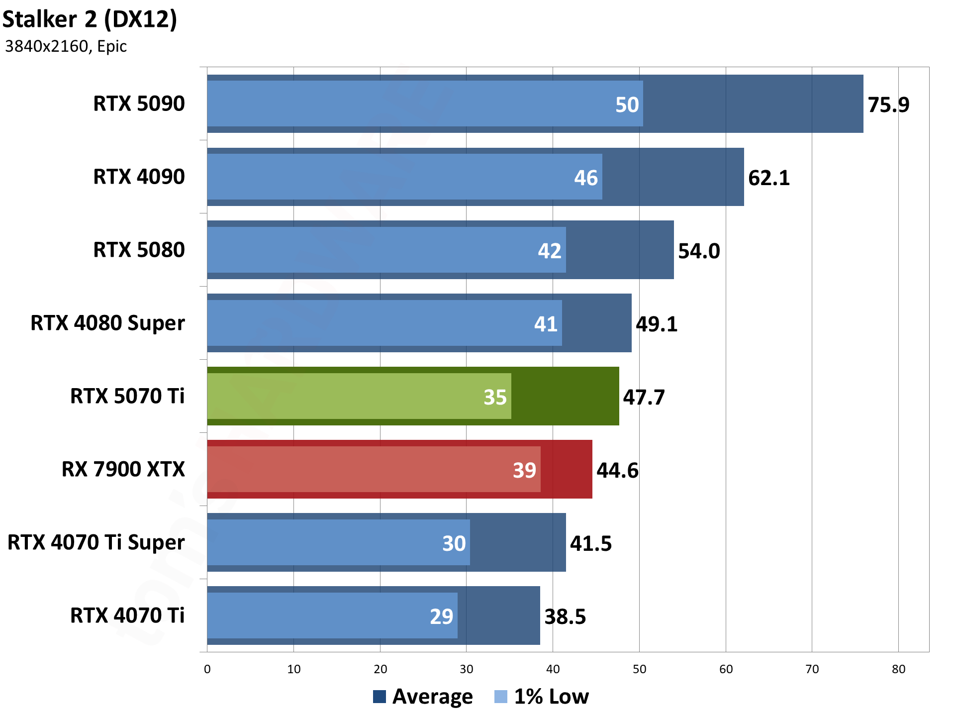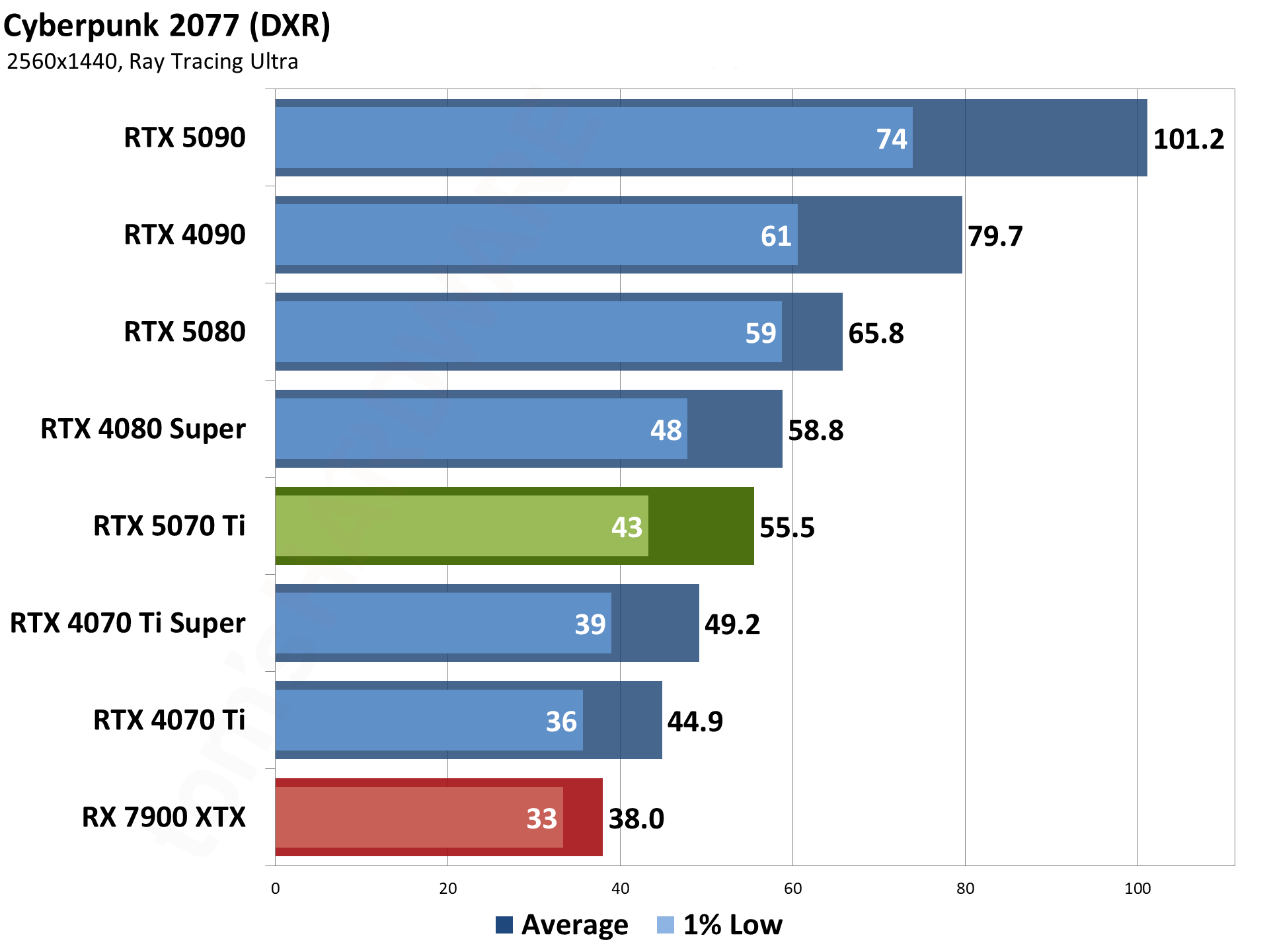 Трассировка лучей стала быстрее — RTX 5070 Ti на 49% опережает RTX 4070 Ti и на 15% — RTX 4070 Ti Super. Radeon RX 7900 XTX, напротив, уступает до 42% в этом режиме.