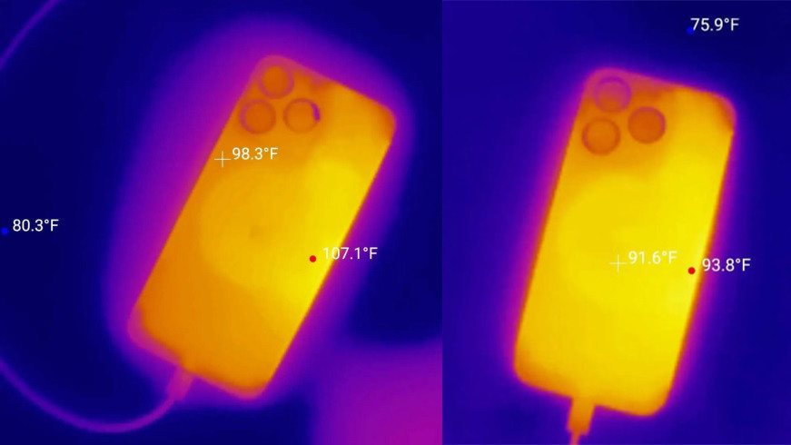 После установки iOS 17.0.3 обе модели iPhone 15 Pro были разряжены до минимума, а затем быстро заряжены с использованием того же механизма, что и ранее. В этот раз температура iPhone была немного выше, но не превысила 93,8 градусов по Фаренгейту (34,33°С). Это свидетельствует о том, что последнее обновление от Apple справилось с задачей: iOS 17.0.3 решает проблему перегрева.