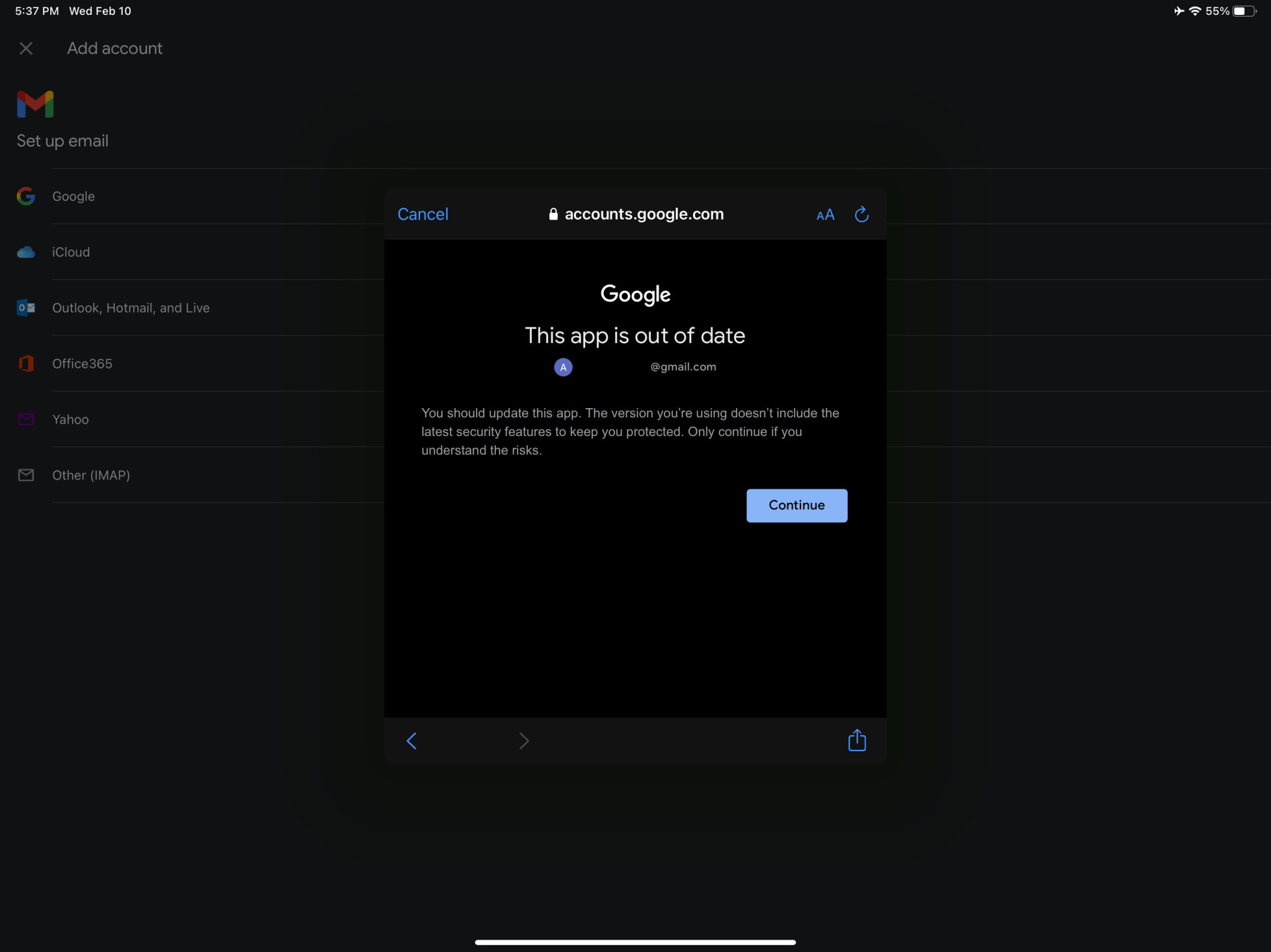Предупреждение об использовании устаревшей версии приложения появляется после того, как вы вводите свой адрес электронной почты программах, для которых не было обновлений с середины декабря. Сюда входят Gmail, YouTube, Google Поиск, Карты, Фото и Диск. Пользователи могут «Продолжить», чтобы ввести свой пароль, но многие, увидев это сообщение, будут склонны посетить App Store и поискать новую версию.