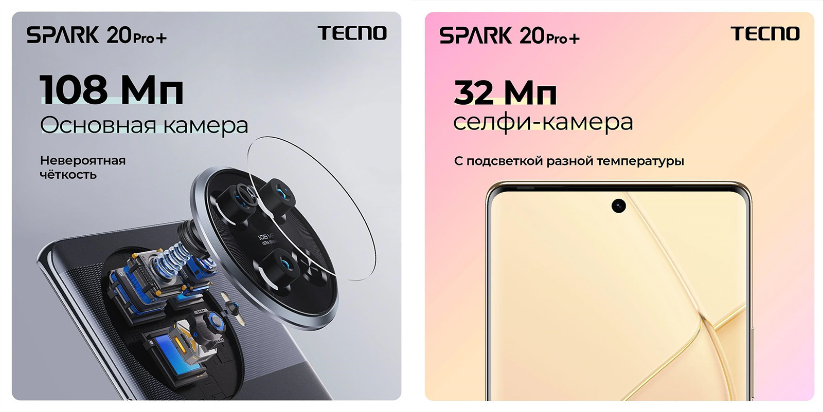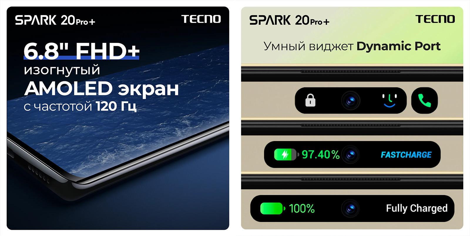 Дизайн SPARK 20 Pro+ приносит новый строгий стиль в линейку SPARK. Смартфон отличается тонким корпусом 7.55 мм с круглым модулем камер в космическом стиле и изогнутым AMOLED-экраном. Продуманная эргономика смартфона позволяет устройству комфортно лежать в руке благодаря симметрично закругленным краям корпуса на 56.5°.