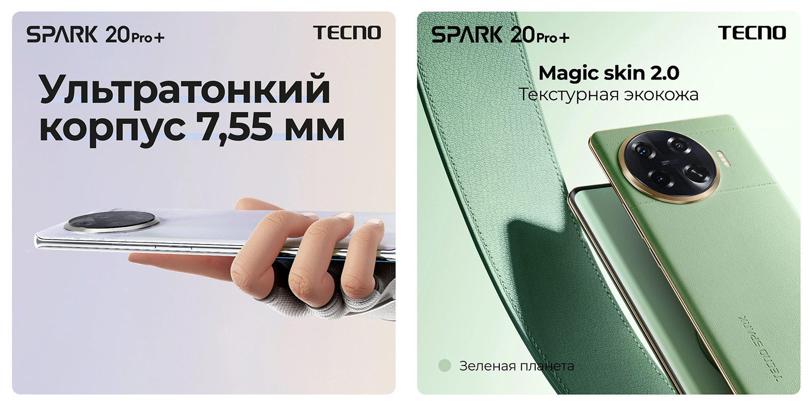 Космические цвета «Чёрная орбита», «Белая луна» и «Золотая звезда» переливаются гармоничным градиентом в зависимости от положения смартфона в пространстве. Смартфон в цвете «Зелёная планета» оснащен панелью из текстурной экокожи Magic Skin 2.0 с имитацией прострочки в виде параллельных линий. В этом цвете SPARK 20 Pro+ выделяется ярким необычным оттенком, мягким на ощупь и экологичным материалом из искусственной кожи.