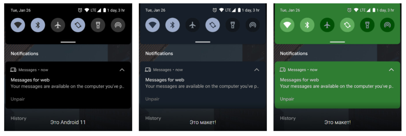 Согласно информации, полученной из версии системы для разработчиков, Android 12 работает над созданием собственной системы тем, которая позволяет вам выбирать основной цвет и цвет акцента и видеть, как эти цвета отражаются во всем Android. Выбранный основной цвет должен даже влиять на такие вещи, как цвет фона уведомлений и область быстрых настроек. Специалисты создали несколько грубых макетов изображений, показывающих, как может выглядеть включенная тема.