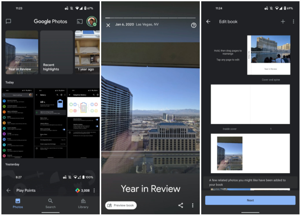 Как и раньше, вы касаетесь краев, чтобы перемещаться назад/вперед, а нажатие и удерживание делает паузу. Дата и место указаны вверху, а в углу есть кнопки «Поделиться» и «Дополнить», которая позволяет «Посмотреть все фотографии этого дня». Наконец, есть кнопка «Предварительный просмотр книги», которая позволяет вам создавать ежегодную фотокнигу. Было добавлено несколько похожих фотографий, которые могут вам понравиться, а вы можете настраивать и добавлять/удалять как обычно.