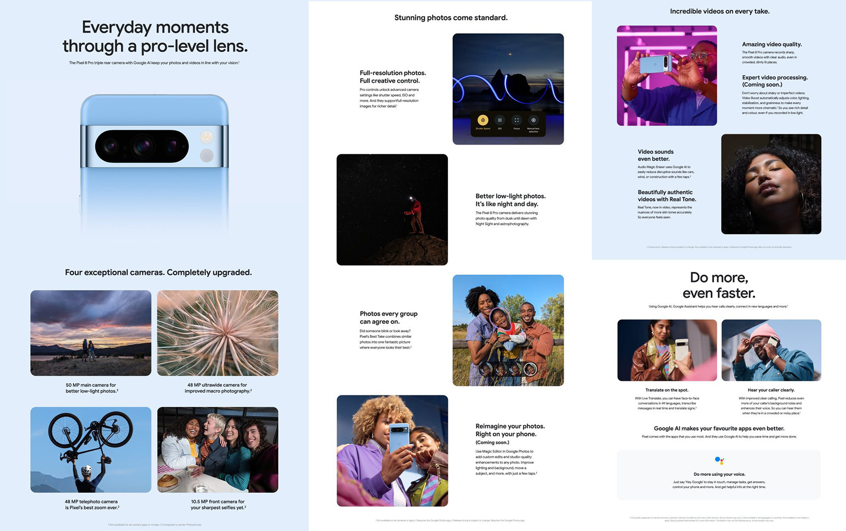 Маркетинговые материалы также уделяют внимание камере Pixel 8 Pro, подчеркивая, как новый 50-мегапиксельный основной сенсор способствует более качественной съемке при низком освещении. Также устройство будет иметь 48-мегапиксельную камеру для широкоугольных снимков и 48-мегапиксельный телеобъектив. Для селфи предусмотрена 10,2-мегапиксельная фронтальная камера.