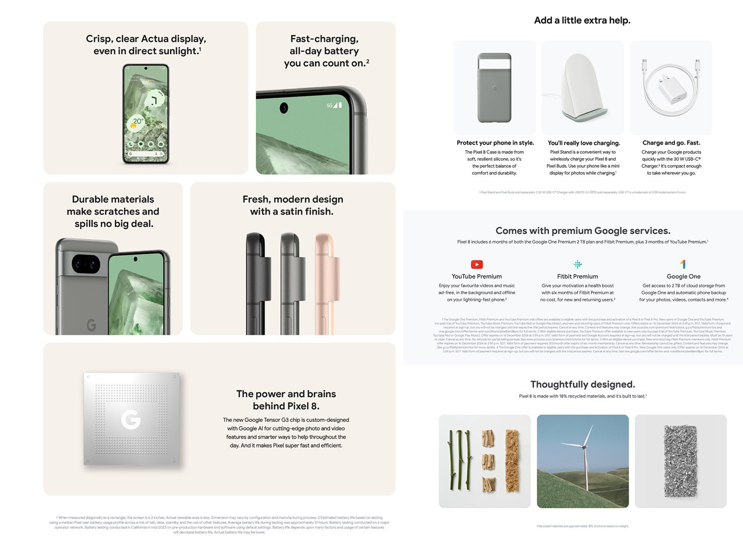 Информация о Pixel 8 и Pixel 8 Pro продолжает просачиваться в публичный доступ. Сегодня мы, наконец, получили полные технические характеристики обеих моделей. В дополнение к этому, стали известны цены на эти смартфоны для США и Великобритании. И на этот раз мы имеем доступ ко всем маркетинговым материалам, связанным с этими устройствами. Не удивительно, ведь Google собирается выпустить эти смартфоны менее чем через две недели.