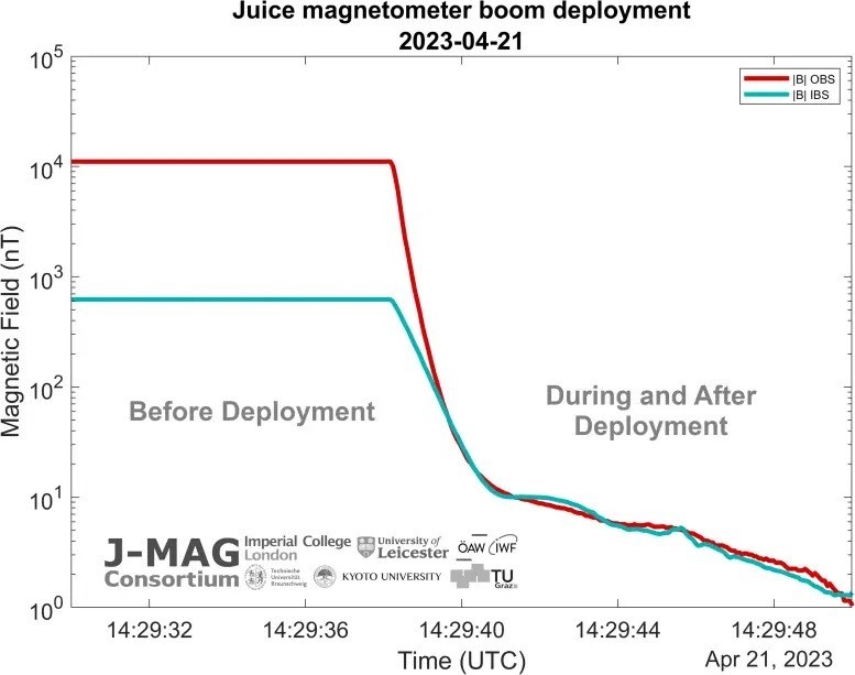 Аппарат успешно развернул свою 10,6-метровую штангу магнитометра (J-MAG) еще 21 апреля, будучи в 1,7 миллиона километров от Земли, которая немедленно начала собирать данные о магнитном поле. Первые полученные данные свидетельствуют об успешном развертывании с прибором, который вскоре вступит в более детальную фазу ввода в эксплуатацию. J-MAG внесет свой вклад в изучение магнитного поля Юпитера и его ледяных спутников, как только Juice достигнет Юпитера в 2031 году.