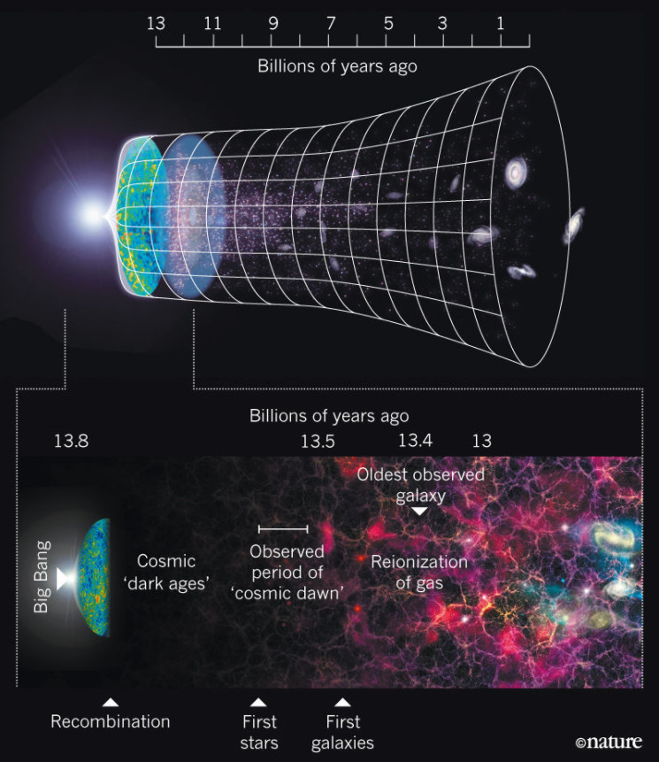 Физики считают, что большой взрыв, 13,8 млрд лет назад, создал ионизированную плазму, которая быстро охлаждалась по мере расширения Вселенной. Примерно через 370 тыс. лет этот «бульон» стал образовывать нейтральные атомы водорода. Со временем — и под влиянием силы притяжения — их скопления образовывали раскаленные звезды, которые начали излучать свет.