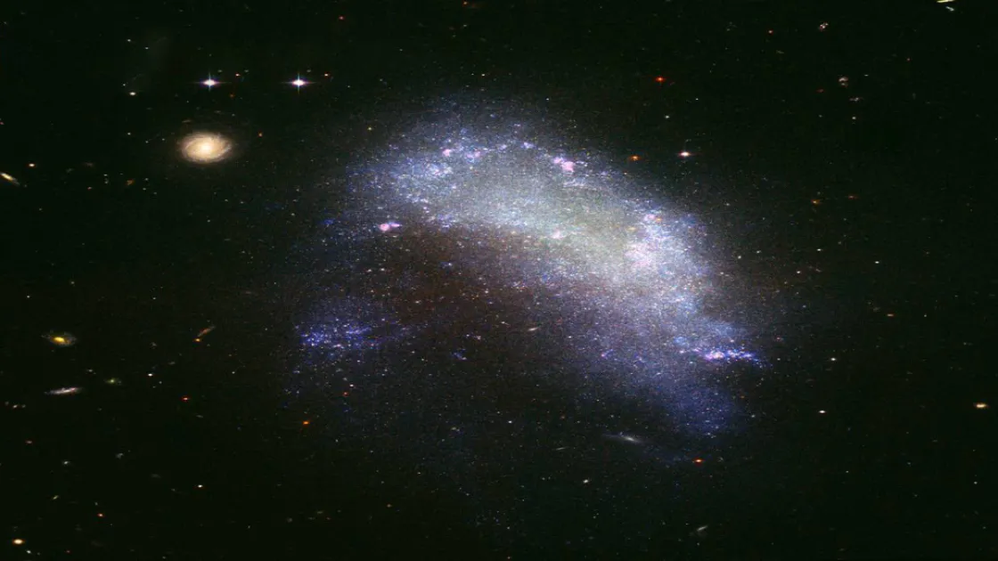 В нижнем левом углу изображения видна галактика NGC 1427A. Этот рваный участок света представляет собой небольшой набор звезд неправильной формы, похожий на Большое Магелланово Облако. Подобно NGC 1404, NGC 1427A движется к сердцу скопления со скоростью примерно 2,2 миллиона километров в час. Это путешествие, в конечном итоге, приведет к разрушению галактики — разрыву гравитационного взаимодействия с другими галактиками.