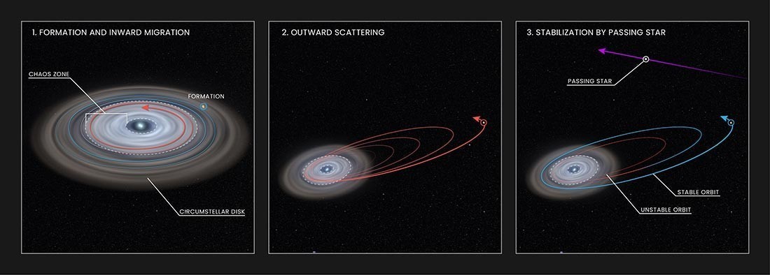 По словам старшего автора Пола Каласа из Калифорнийского университета в Беркли, адъюнкт-профессора астрономии, сходство с орбитой предложенной Девятой Планеты показывает, что такие далекие планеты действительно могут существовать и что они могут образоваться в течение первых десятков миллионов лет. жизни звезды. И, судя по другим недавним открытиям группы о HD 106906, планета, похоже, предпочитает сценарий, в котором проходящие звезды также играют роль.