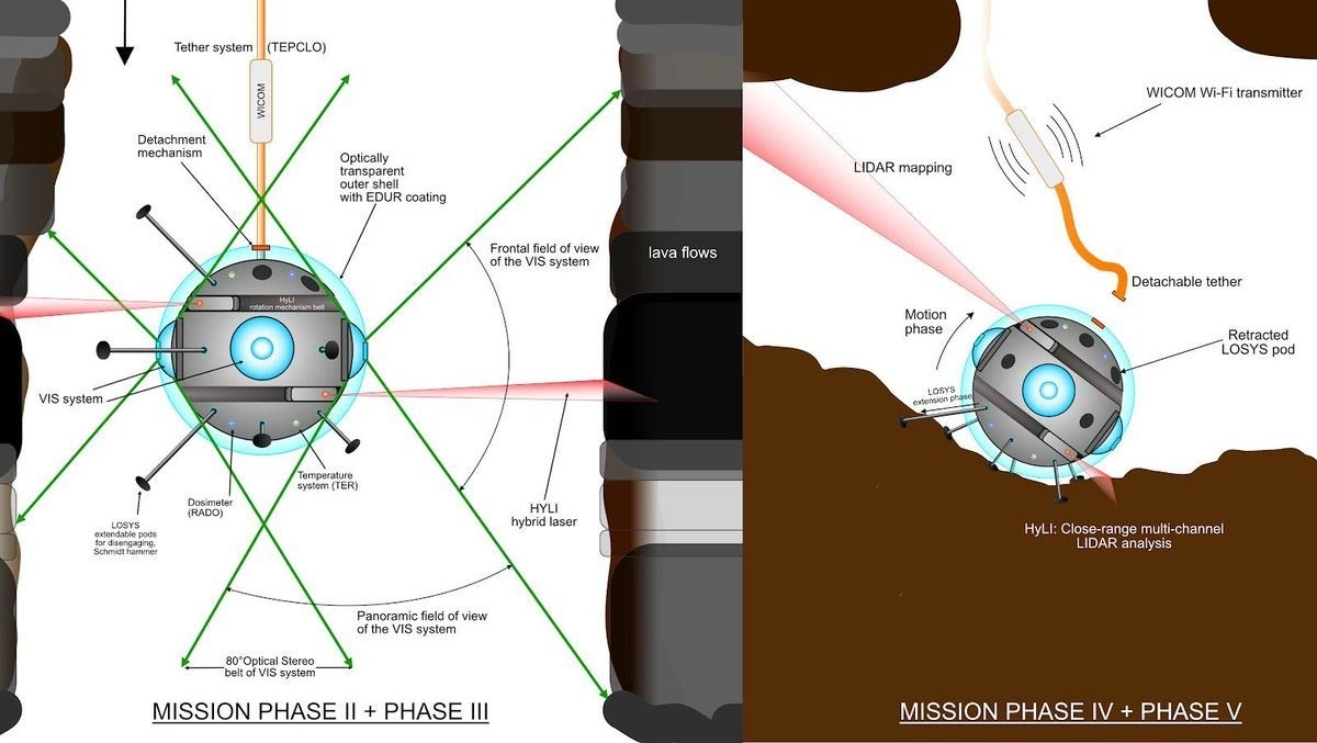 Сфера DAEDALUS диаметром 46см будет нести иммерсивную стереоскопическую камеру, лидарную систему «лазерный радар» для трехмерного картирования интерьеров пещер, датчики температуры и дозиметр излучения, а также выдвижные кронштейны, которые помогут преодолевать препятствия и проверять свойства горных пород.