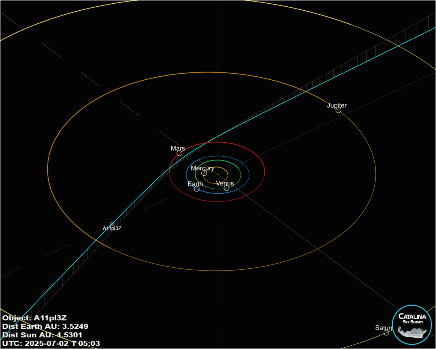 Сейчас A11pl3Z находится внутри орбиты Юпитера и продолжает двигаться к Солнцу. По расчётам, максимальное сближение с Землёй произойдёт в октябре, когда он пройдёт внутри орбиты Марса. Но волноваться не стоит: объект не пересечётся с нашей траекторией и окажется на противоположной стороне от нас по отношению к Солнцу.