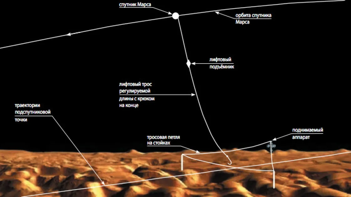 В статье рассмотрен альтернативный ракетной технике вывода полезной нагрузки в космос способ использования тросовой системы, одним концом закрепленной на спутнике Марса. Подъемное устройство на тросе должно подцеплять находящийся на Марсе космический аппарат подобно тормозному захвату палубного самолета на авианосце. Необходимая техника для создания космического лифта, по прогнозам ученых, будет разработана в ближайшие десятилетия.