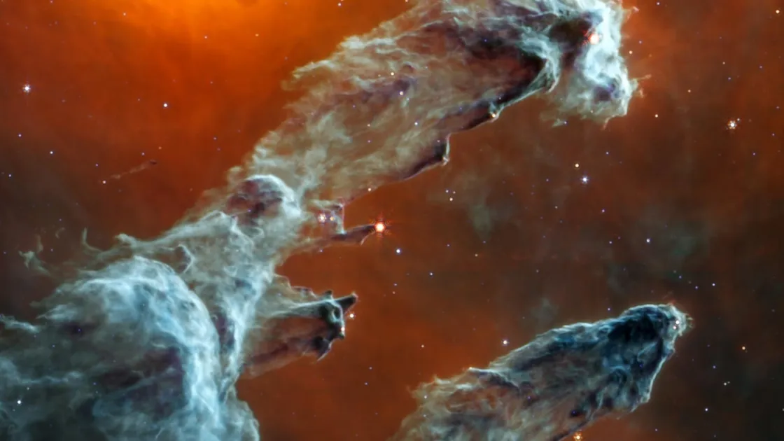На этом изображении не показаны протянутые пальцы с оттенком сажи. И это не эфирный ландшафт забытых временем гробниц. Эти столбы, плотно заполненные газом и пылью, окутывают звезды, которые медленно формируются на протяжении многих тысячелетий. Этот жуткий, чрезвычайно запыленный вид Столпов Творения был запечатлен в среднем инфракрасном свете космическим телескопом NASA James Webb. Это совершенно новый и жуткий взгляд на знакомый пейзаж.