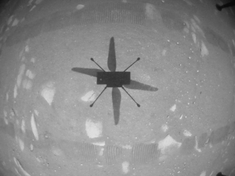 Вертолет на солнечной энергии впервые поднялся в воздух в 3:34 утра по восточному поясному времени (12:34 по тихоокеанскому времени) — 12:33 по местному среднему солнечному времени (по марсианскому времени) — время, в которое, как определила команда Ingenuity, будет оптимальная энергия и условия полета. Данные высотомера показывают, что Ingenuity поднялся на предписанную максимальную высоту 3 метра и удерживал стабильное парение в течение 30 секунд. Затем он снизился, коснувшись поверхности Марса после 39,1 секунды полета. Дополнительные сведения о тесте ожидаются в следующих нисходящих каналах связи.