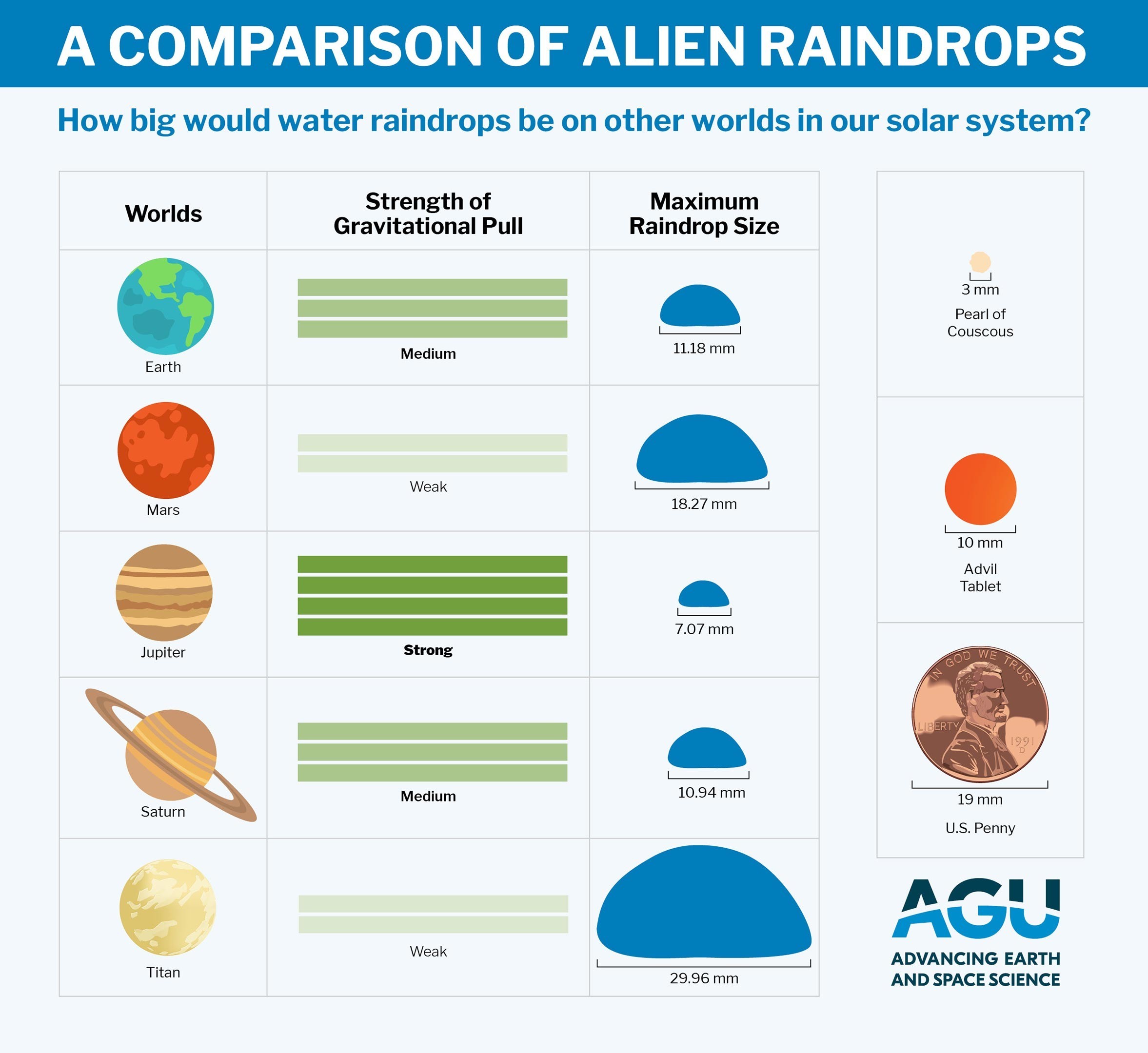 Согласно расчетам исследователей, даже когда из разных жидкостей образуются капли дождя, эти инопланетные капли не так сильно отличаются от привычных водяных. Например, самые большие капли метанового дождя на Титане будут примерно в два раза больше водяного дождя на Земле.