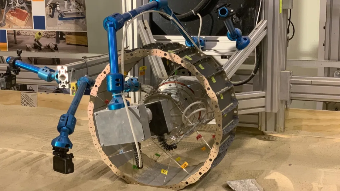 В имитаторе лунного грунта были созданы четкие уклоны, а следы колеса изучались после любого значительного проскальзывания. Датчики позволяют команде измерять, насколько колесо погрузилось в почву, его тяговые характеристики и то, как оно маневрирует на камнях.