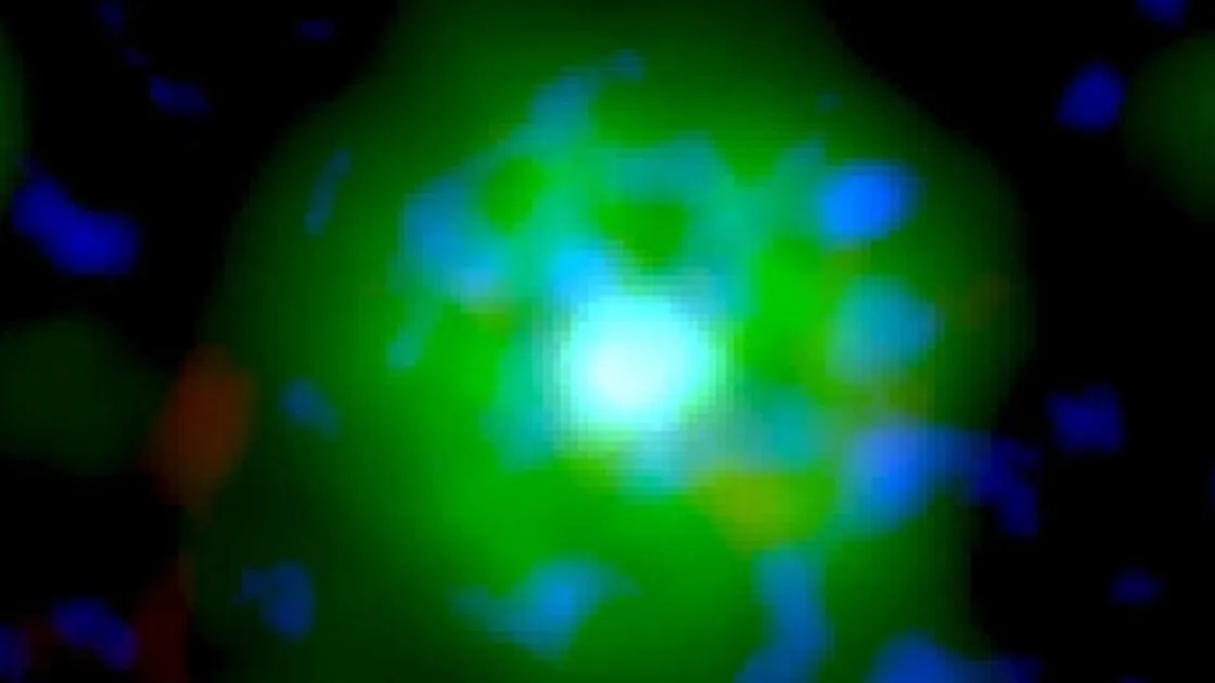 Основываясь на новой информации от XMM-Newton, Лидия и ее команда теперь предполагают, что то, что мы видим на изображении, представляет собой источник рентгеновского излучения нового типа, созданный в результате слияния двух белых карликов. Остаток столкновения — туманность — также виден на этом изображении и в основном состоит из элемента неона (показан зеленым). Звезда очень нестабильна и, вероятно, схлопнется в нейтронную звезду в течение 10 000 лет.