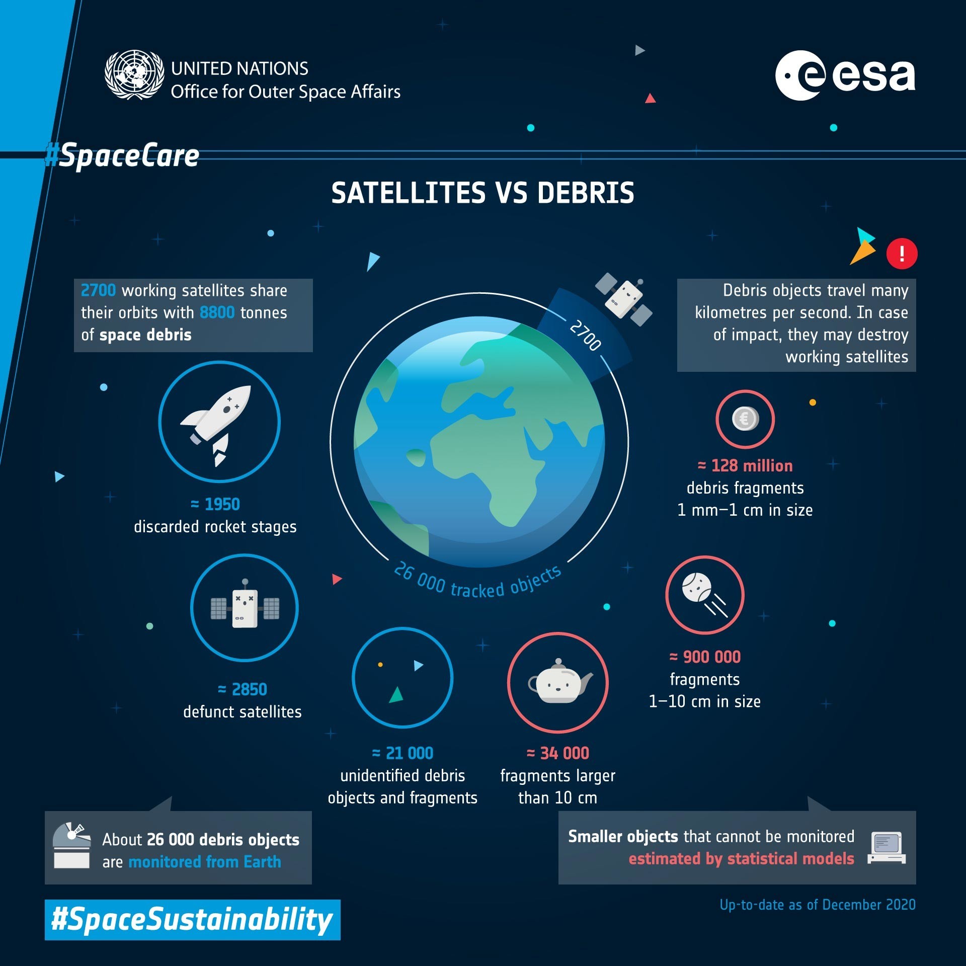 Эта новая серия инфографики, совместно созданная ЕКА и UNOOSA, включает привлекательные, простые для понимания иллюстрации, факты и цифры, чтобы каждый, с или без каких-либо предварительных знаний о космических полетах, мог понять космический мусор и проблемы, которые он создает. Они охватывают такие темы, как создание мусора, способы предотвращения столкновений, риск для людей в космосе из-за мусора и на Земле из-за повторного входа в атмосферу, а также технологии безопасного смягчения и удаления мусора.