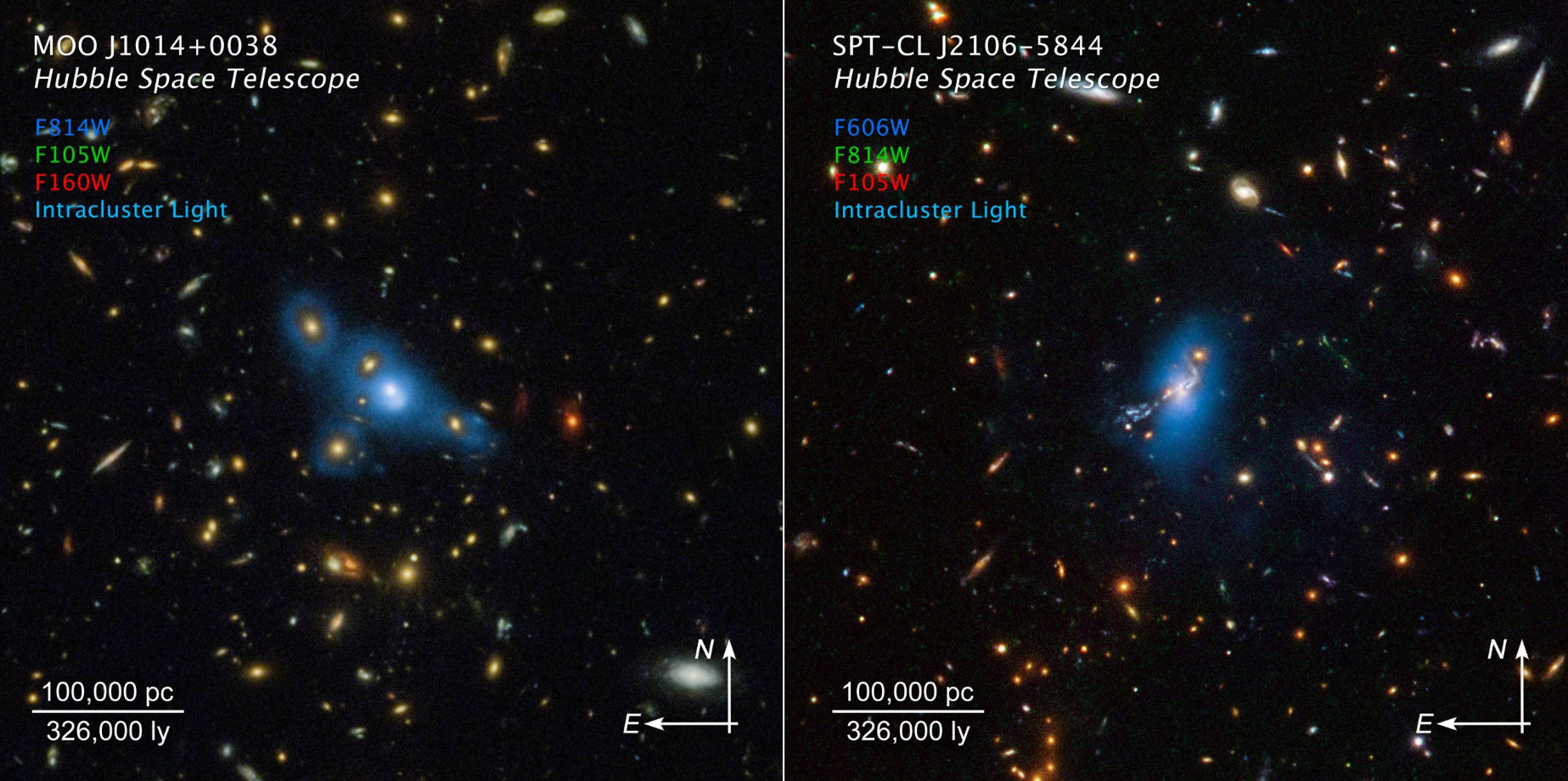 В гигантских скоплениях из сотен тысяч галактик бесчисленные звезды блуждают среди них, как заблудшие души, излучая призрачную дымку света. Эти звезды не связаны гравитацией ни с одной галактикой в скоплении.