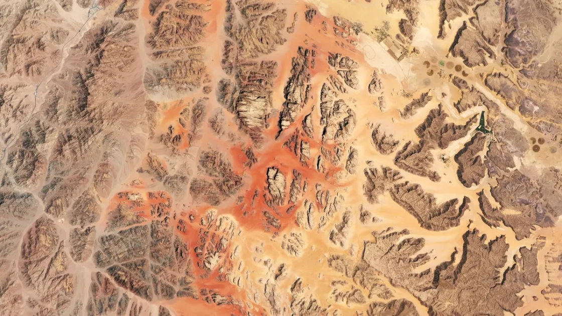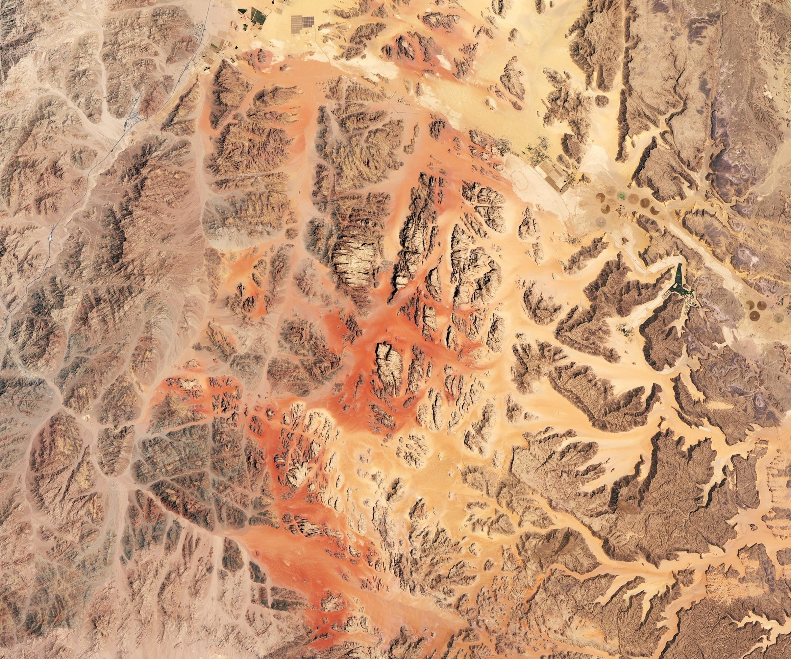 Если посмотреть из космоса, легко понять, почему Скотт выбрал это место. Цвета и текстуры Вади-Рам, показанные на изображении Landsat 8 в естественных цветах, очень похожи на те, что есть на Марсе. Область, которая появляется в фильме несколько раз, представляет собой высокие песчаниковые и гранитные инзельберги, которые пересекают долины, покрытые богатым железом песком. Он включает в себя одно из самых знаковых скальных образований региона: Семь столпов мудрости, группу столбов из природного камня, которые выступают с северной окраины Джебель-Ум-Ишрин.