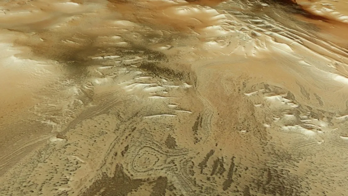 Северная часть изображения все больше покрывается светлой пылью, но следы пауков все еще можно наблюдать на плато, скрывающемся среди различных каньонов и впадин.