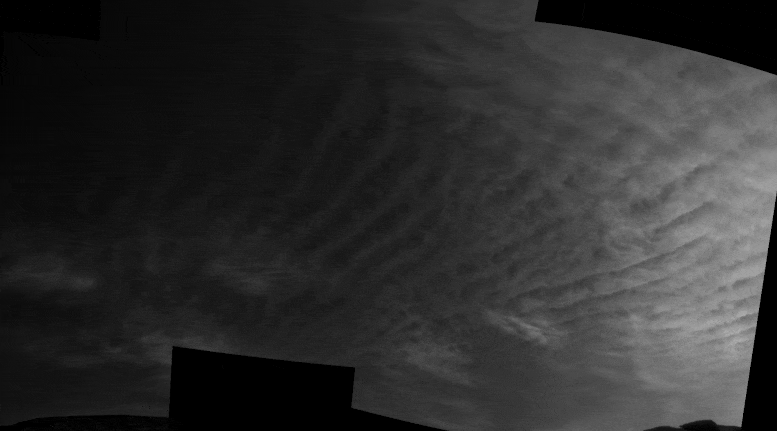 Мелкие волнистые структуры этих облаков легче увидеть с помощью изображений с черно-белых навигационных камер Curiosity. Но по-настоящему сияют цветные изображения с мачтовой камеры марсохода или Mastcam. Их ледяные кристаллы, наблюдаемые сразу после заката, отражают угасающий свет, заставляя их светиться на фоне темнеющего неба. Эти сумеречные облака, также известные как «серебристые» (на латыни «сияющая ночь») облака, становятся ярче по мере того, как они заполняются кристаллами, а затем темнеют, когда положение Солнца в небе опускается ниже их высоты. Это всего лишь одна полезная подсказка, которую используют ученые, чтобы определить их высоту над поверхностью.